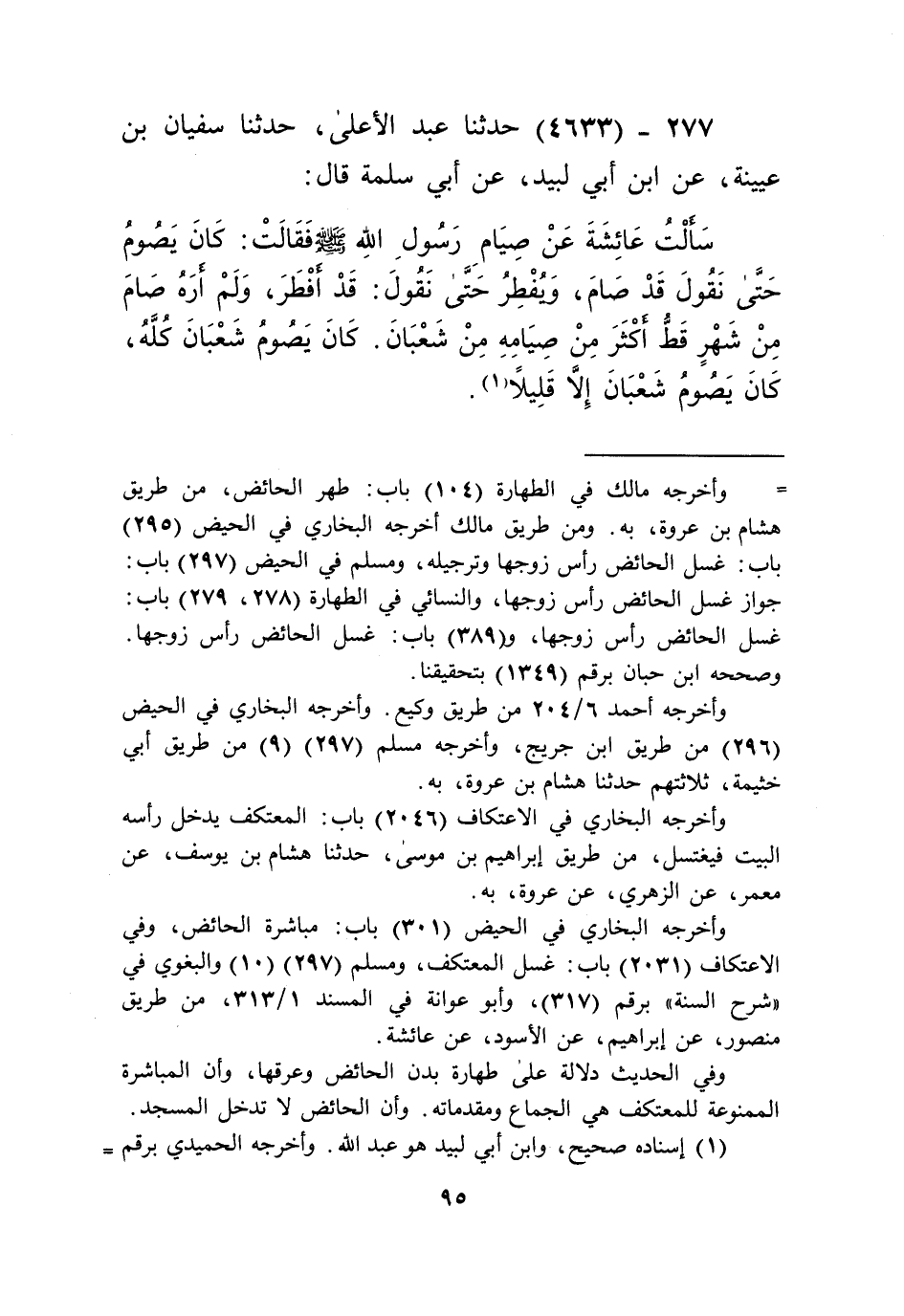 4633 - حَدَّثَنَا عَبْدُ الْأَعْلَى، حَدَّثَنَا سُفْيَانُ بْنُ عُيَيْنَةَ، عَنِ ابْنِ أَبِي لَبِيدٍ، عَنْ أَبِي سَلَمَةَ قَالَ: سَأَلْتُ عَائِشَةَ عَنْ صِيَامِ رَسُولِ اللَّهِ صَلَّى اللهُ عَلَيْهِ وَسَلَّمَ فَقَالَتْ: «§كَانَ يَصُومُ حَتَّى نَقُولَ قَدْ صَامَ وَيُفْطِرُ حَتَّى نَقُولَ قَدْ أَفْطَرَ، وَلَمْ أَرَهُ صَامَ مِنْ شَهْرٍ قَطُّ أَكْثَرَ مِنْ صِيَامِهِ مِنْ شَعْبَانَ. كَانَ يَصُومُ شَعْبَانَ كُلَّهُ. كَانَ يَصُومُ شَعْبَانَ إِلَّا قَلِيلًا» Kإسناده صحيح