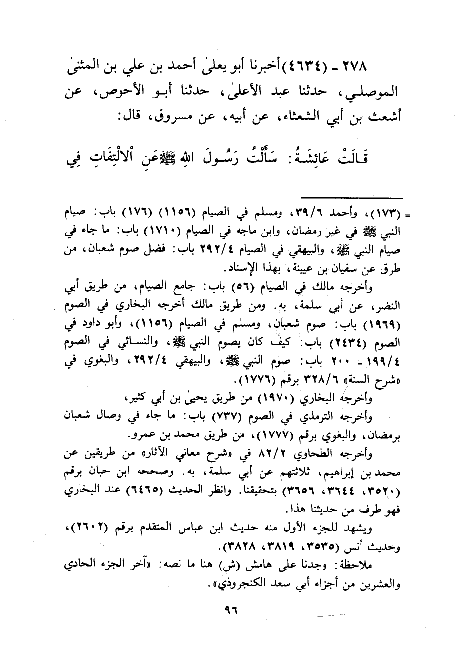 4634 - أخبرنا أبو يعلى أحمد بن علي بن المثنى الموصلي حَدَّثَنَا عَبْدُ الْأَعْلَى، حَدَّثَنَا أَبُو الْأَحْوَصِ، عَنْ أَشْعَثَ بْنِ أَبِي الشَّعْثَاءِ، عَنْ أَبِيهِ، عَنْ مَسْرُوقٍ قَالَ: قَالَتْ عَائِشَةُ: سَأَلْتُ رَسُولَ اللَّهِ صَلَّى اللهُ عَلَيْهِ وَسَلَّمَ عَنِ الِالْتِفَاتِ فِي الصَّلَاةِ فَقَالَ: «§اخْتِلَاسٌ يَخْتَلِسُهُ الشَّيْطَانُ مِنْ صَلَاةِ الْعَبْدِ» Kإسناده صحيح