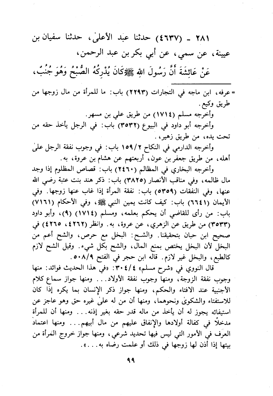 4637 - حَدَّثَنَا عَبْدُ الْأَعْلَى، حَدَّثَنَا سُفْيَانُ بْنُ عُيَيْنَةَ، عَنْ سُمَيٍّ، عَنْ أَبِي بَكْرِ بْنِ عَبْدِ الرَّحْمَنِ، عَنْ عَائِشَةَ أَنَّ رَسُولَ اللَّهِ صَلَّى اللهُ عَلَيْهِ وَسَلَّمَ كَانَ «§يُدْرِكُهُ الصُّبْحُ وَهُوَ جُنُبٌ، ثُمَّ يُصْبِحُ صَائِمًا» Kإسناده صحيح