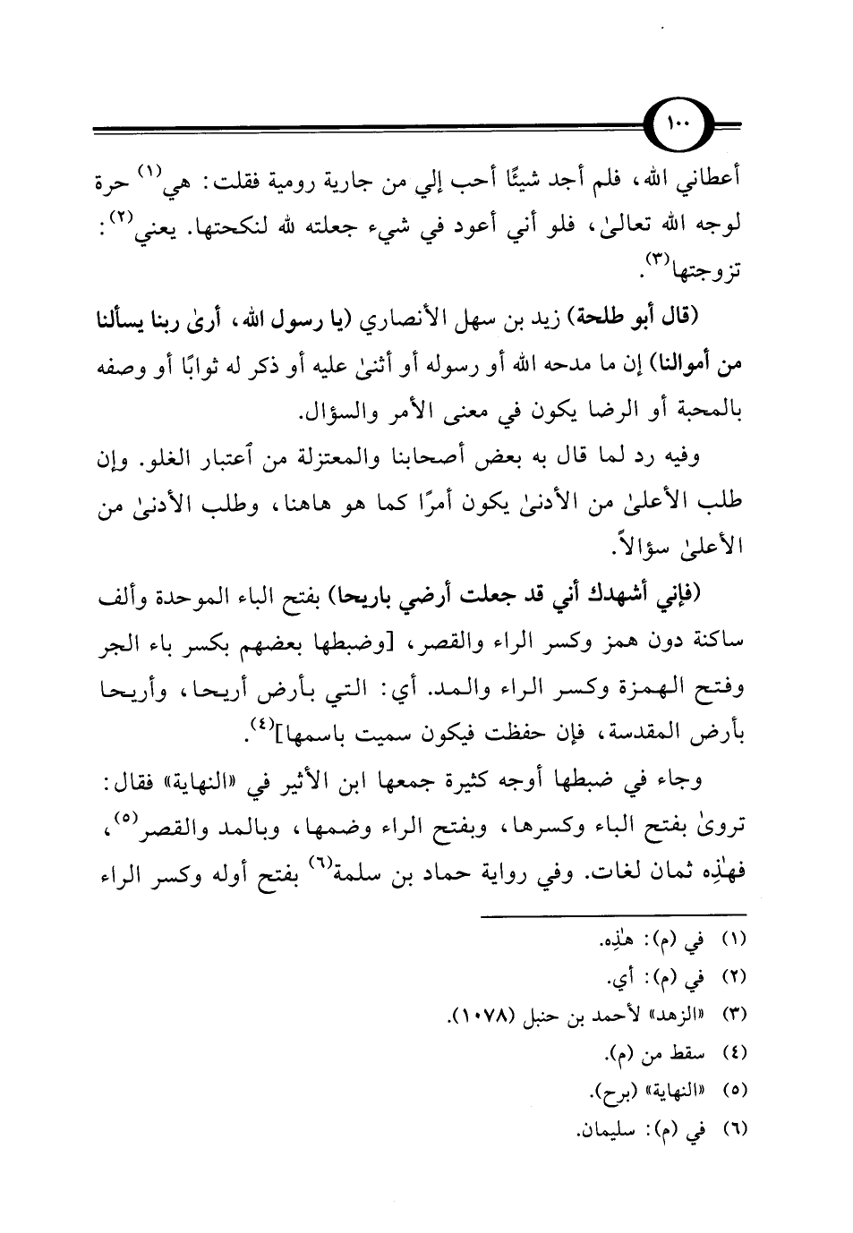 (فإني أشهدك أني قد جعلت أرضي باريحا) بفتح الباء الموحدة وألف ساكنة دون همز وكسر الراء والقصر، [وضبطها بعضهم بكسر باء الجر وفتح الهمزة وكسر الراء والمد. أي: التي بأرض أريحا، وأريحا بأرض المقدسة، فإن حفظت فيكون سميت باسمها] (¬4).