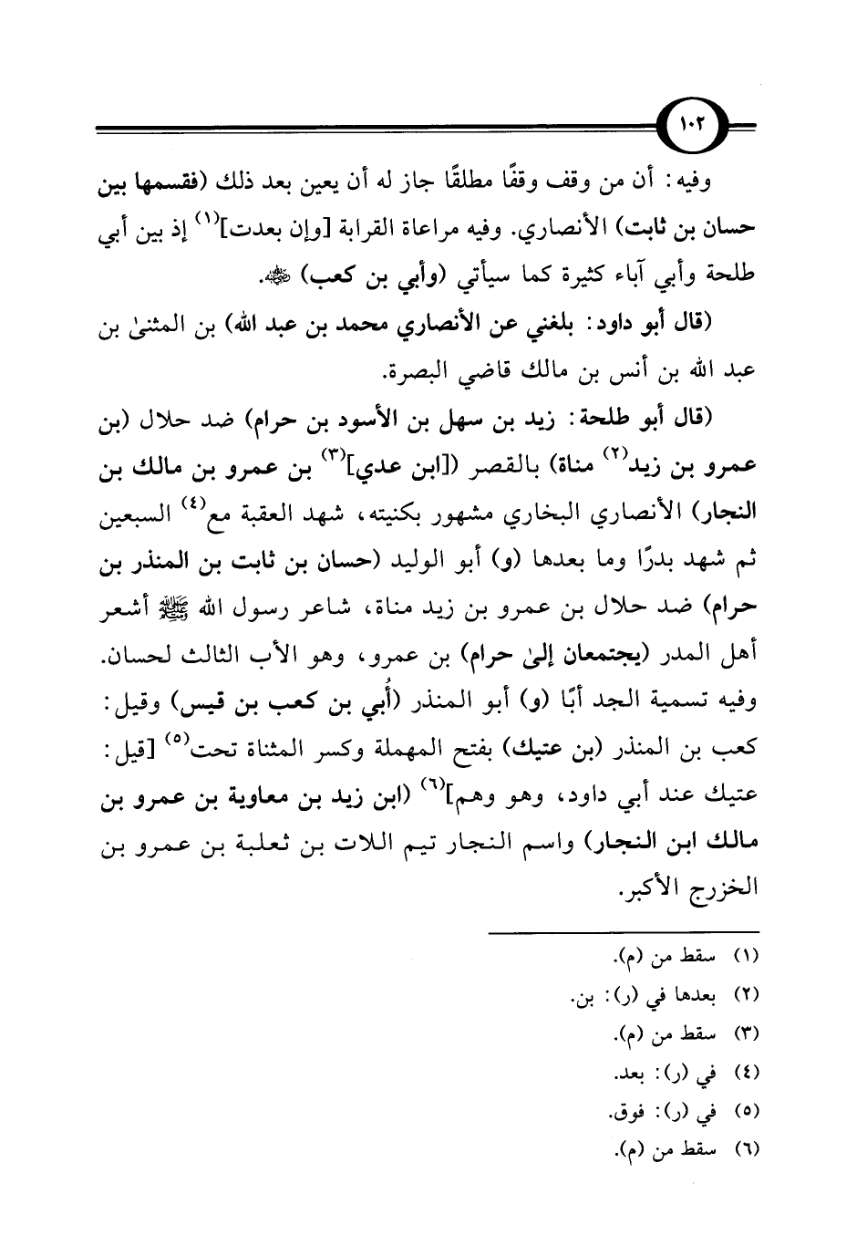 وفيه: أن من وقف وقفًا مطلقًا جاز له أن يعين بعد ذلك (فقسمها بين حسان بن ثابت) الأنصاري. وفيه مراعاة القرابة [وإن بعدت] (¬1) إذ بين أبي طلحة وأبي آباء كثيرة كما سيأتي (وأبي بن كعب) - رضي الله عنه -.