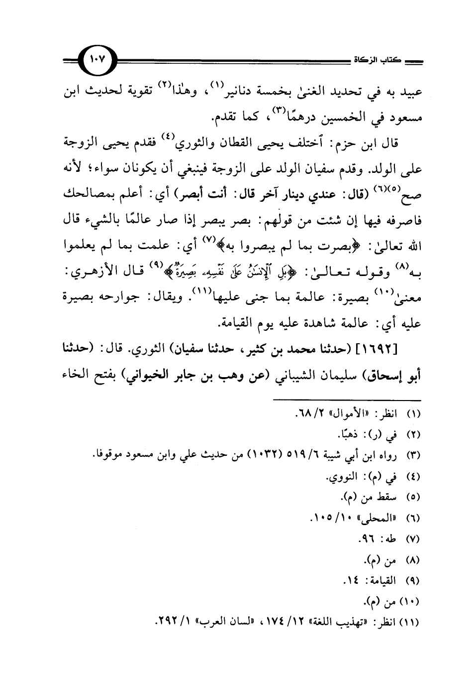 قال ابن حزم: اختلف يحيى القطان والثوري (¬4) فقدم يحيى الزوجة على الولد. وقدم سفيان الولد على الزوجة فينبغي أن يكونان سواء؛ لأنه صح (¬5) (¬6) (قال: عندي دينار آخر قال: أنت أبصر) أي: أعلم بمصالحك فاصرفه فيها إن شئت من قولهم: بصر يبصر إذا صار عالمًا بالشيء قال الله تعالى: {بَصُرْتُ بِمَا لَمْ يَبْصُرُوا بِهِ} (¬7) أي: علمت بما لم يعلموا به (¬8) وقوله تعالى: {بَلِ الْإِنْسَانُ عَلَى نَفْسِهِ بَصِيرَةٌ} (¬9) قال الأزهري: معنى (¬10) بصيرة: عالمة بما جنى عليها (¬11). ويقال: جوارحه بصيرة عليه أي: عالمة شاهدة عليه يوم القيامة.