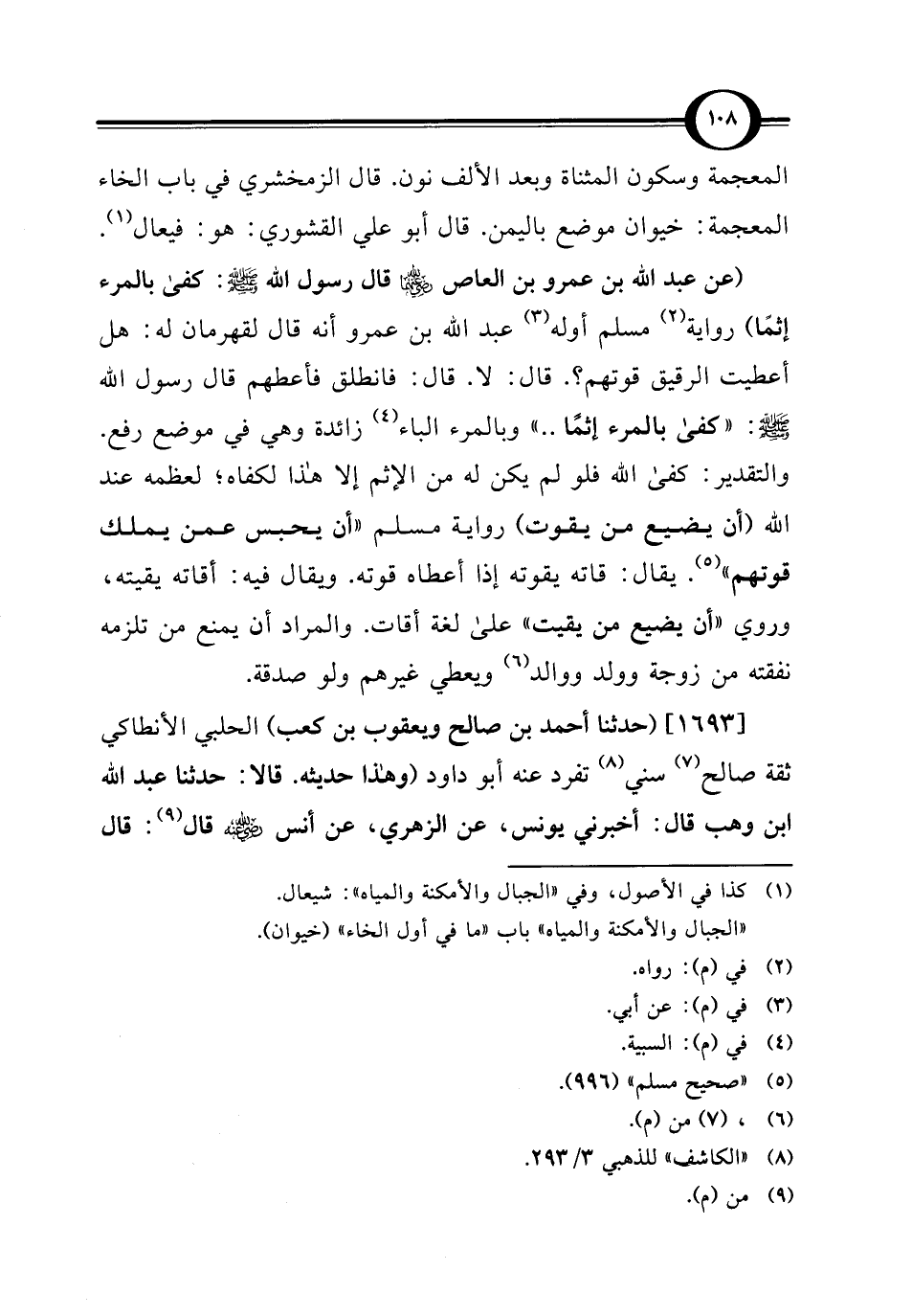 (عن عبد الله بن عمرو بن العاص - رضي الله عنهما - قال رسول الله - صلى الله عليه وسلم -: كفى بالمرء إثمًا) رواية (¬2) مسلم أوله (¬3) عبد الله بن عمرو أنه قال لقهرمان له: هل أعطيت الرقيق قوتهم؟ . قال: لا. قال: فانطلق فأعطهم قال رسول الله - صلى الله عليه وسلم -: "كفى بالمرء إثمًا. ." وبالمرء الباء (¬4) زائدة وهي في موضع رفع. والتقدير: كفى الله فلو لم يكن له من الإثم إلا هذا لكفاه؛ لعظمه عند الله (أن يضيع من يقوت) رواية مسلم "أن يحبس عمن يملك قوتهم" (¬5). يقال: قاته يقوته إذا أعطاه قوته. ويقال فيه: أقاته يقيته، وروي "أن يضيع من يقيت" على لغة أقات. والمراد أن يمنع من تلزمه نفقته من زوجة وولد ووالد (¬6) ويعطي غيرهم ولو صدقة.