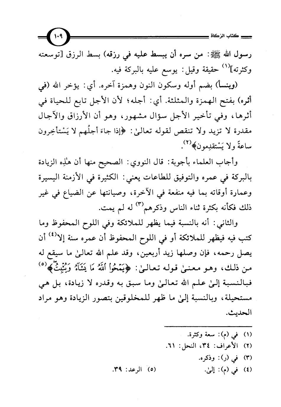 والثاني: أنه بالنسبة فيما يظهر للملائكة وفي اللوح المحفوظ وما كتب فيه فيظهر للملائكة أو في اللوح المحفوظ أن عمره سنة إلا (¬4) أن يصل رحمه، فإن وصلها زيد أربعين، وقد علم الله تعالى ما سيقع له من ذلك، وهو معنى قوله تعالى: {يَمْحُو اللَّهُ مَا يَشَاءُ وَيُثْبِتُ} (¬5) فبالنسبة إلى علم الله تعالى وما سبق به وقدره لا زيادة، بل هي مستحيلة، وبالنسبة إلى ما ظهر للمخلوقين بتصور الزيادة وهو مراد الحديث.