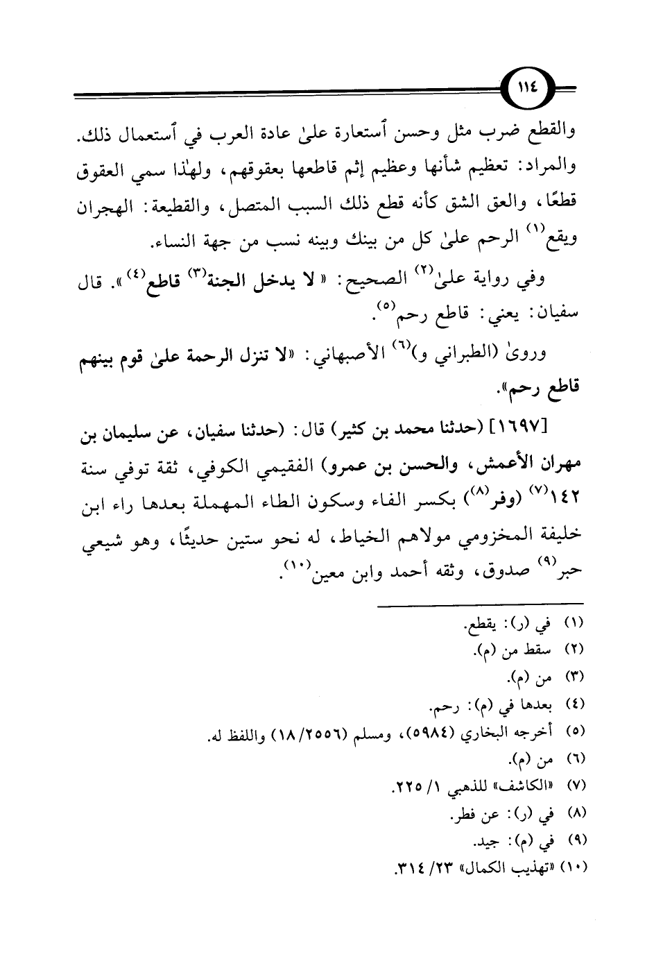 [1697] (حدثنا محمد بن كثير) قال: (حدثنا سفيان، عن سليمان بن مهران الأعمش، والحسن بن عمرو) الفقيمي الكوفي، ثقة توفي سنة 142 (¬7) (وفر) (¬8) بكسر الفاء وسكون الطاء المهملة بعدها راء ابن خليفة المخزومي مولاهم الخياط، له نحو ستين حديثًا، وهو شيعي حبر (¬9) صدوق، وثقه أحمد وابن معين (¬10).
