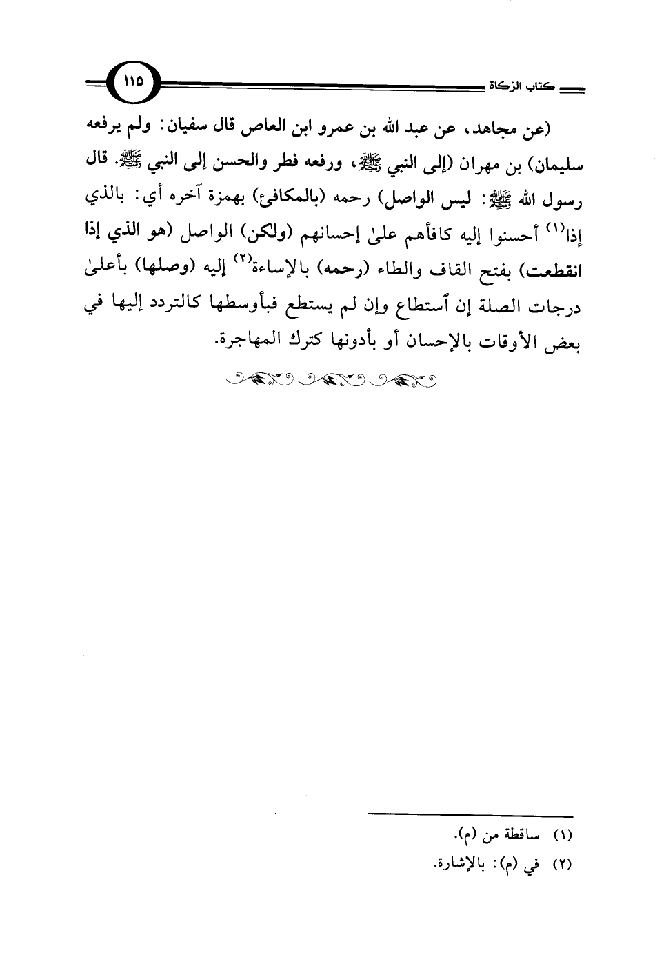 (عن مجاهد، عن عبد الله بن عمرو ابن العاص قال سفيان: ولم يرفعه سليمان) بن مهران (إلى النبي - صلى الله عليه وسلم -، ورفعه فطر والحسن إلى النبي - صلى الله عليه وسلم -. قال رسول الله - صلى الله عليه وسلم -: ليس الواصل) رحمه (بالمكافئ) بهمزة آخره أي: بالذي إذا (¬1) أحسنوا إليه كافأهم على إحسانهم (ولكن) الواصل (هو الذي إذا انقطعت) بفتح القاف والطاء (رحمه) بالإساءة (¬2) إليه (وصلها) بأعلى درجات الصلة إن استطاع وإن لم يستطع فبأوسطها كالتردد إليها في بعض الأوقات بالإحسان أو بأدونها كترك المهاجرة.