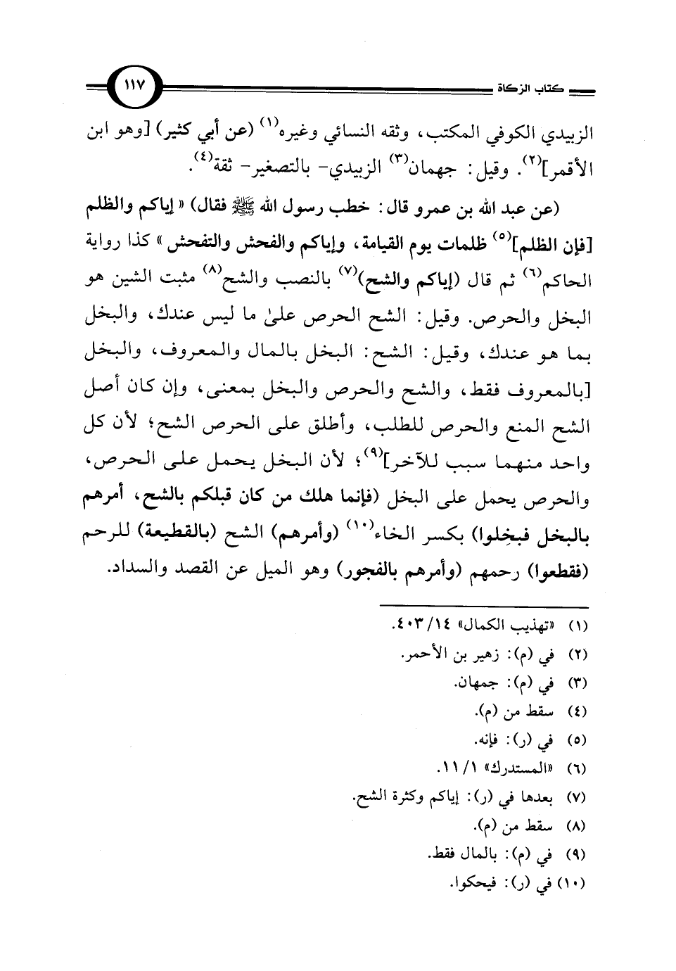 (عن عبد الله بن عمرو قال: خطب رسول الله - صلى الله عليه وسلم - فقال) "إياكم والظلم [فإن الظلم] (¬5) ظلمات يوم القيامة، وإياكم والفحش والتفحش" كذا رواية الحاكم (¬6) ثم قال (إياكم والشح) (¬7) بالنصب والشح (¬8) مثبت الشين هو البخل والحرص. وقيل: الشح الحرص على ما ليس عندك، والبخل بما هو عندك، وقيل: الشح: البخل بالمال والمعروف، والبخل [بالمعروف فقط، والشح والحرص والبخل بمعنى، وإن كان أصل الشح المنع والحرص للطلب، وأطلق على الحرص الشح؛ لأن كل واحد منهما سبب للآخر] (¬9)؛ لأن البخل يحمل على الحرص، والحرص يحمل على البخل (فإنما هلك من كان قبلكم بالشح، أمرهم بالبخل فبخِلوا) بكسر الخاء (¬10) (وأمرهم) الشح (بالقطيعة) للرحم (فقطعوا) رحمهم (وأمرهم بالفجور) وهو الميل عن القصد والسداد.