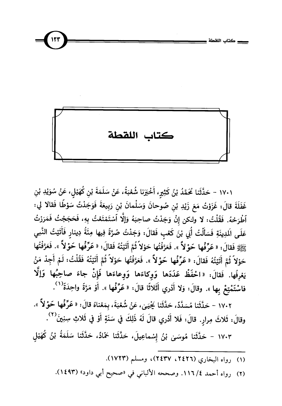 1701 - حَدَّثَنا مُحَمَّدُ بْنُ كَثِيرٍ، أَخْبَرَنا شُعْبَةُ، عَنْ سَلَمَةَ بْنِ كُهَيْلٍ، عَنْ سُوَيْدِ بْنِ غَفَلَةَ قَالَ: غَزَوْتُ مَعَ زَيْدِ بْنِ صُوحانَ وَسَلْمانَ بْنِ رَبِيعَةَ فَوَجَدْتُ سَوْطًا فَقالا لي: اطْرَحْهُ. فَقُلْتُ: لا ولكن انْ وَجَدْتُ صاحِبَهُ وَإِلَّا اسْتَمْتَعْتُ بِهِ، فَحَجَجْتُ فَمَرَرْتُ عَلَى المَدِينَةِ فَسَأَلْتُ أُبَي بْنَ كَعْبٍ فَقَالَ: وَجَدْتُ صُرَّةً فِيها مِئَةُ دِينارٍ فَأَتَيْتُ النَّبي - صلى الله عليه وسلم - فَقَالَ: "عَرِّفْها حَوْلًا". فَعَرَّفْتُها حَوْلًا ثُمَّ أَتَيْتُهُ فَقَالَ: "عَرِّفْها حَوْلًا". فَعَرَّفْتُها حَوْلًا ثُمَّ أَتَيْتُهُ فَقَالَ: "عَرِّفْها حَوْلًا". فَعَرَّفْتُها حَوْلًا ثُمَّ أَتَيْتُهُ فَقُلْتُ: لَمْ أَجِدْ مَنْ يَعْرِفُها. فَقَالَ: "احْفَظْ عَدَدَها وَوِكاءَها وَوِعاءَها فَإِنْ جاءَ صاحِبُها وَإِلَّا فاسْتَمْتِعْ بِها". وقَالَ: وَلا أَدْري أَثَلاثًا قَالَ: "عَرِّفْها". أَوْ مَرَّةً واحِدَةً (¬1).