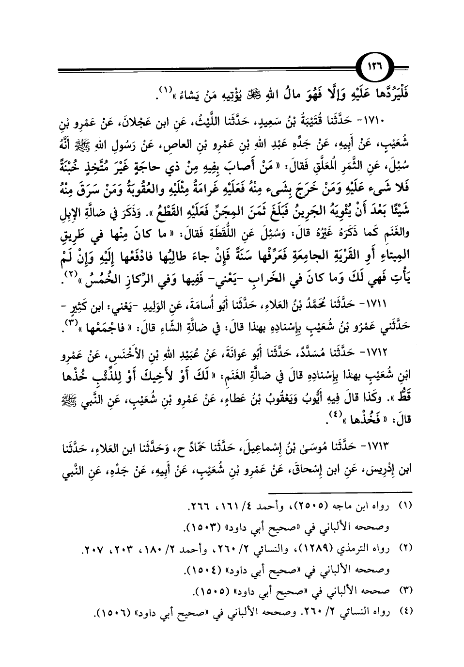 1711 - حَدَّثَنا مُحَمَّدُ بْنُ العَلاءِ، حَدَّثَنا أَبُو أُسامَةَ، عَنِ الوَلِيدِ - يَعْني: ابن كَثِيرٍ - حَدَّثَني عَمْرُو بْنُ شُعَيْبٍ بِإِسْنادِهِ بهذا قَالَ: في ضالَّةِ الشّاءِ قَالَ: "فاجْمَعْها" (¬3).