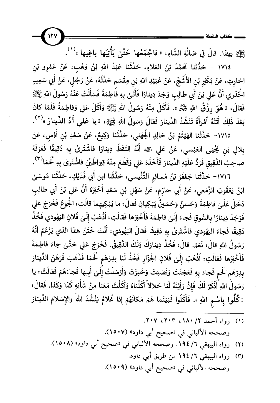 1715 - حَدَّثَنا الهَيْثَمُ بْنُ خالِدٍ الجُهَني، حَدَّثَنا وَكِيعٌ، عَنْ سَعْدِ بْنِ أَوْسٍ، عَنْ بِلالِ بْنِ يَحْيَى العَبْسي، عَنْ عَلي - رضي الله عنه - أَنَّهُ التَقَطَ دِينارًا فاشْتَرى بِهِ دَقِيقًا فَعَرَفَهُ صاحِبُ الدَّقِيقِ فَرَدَّ عَلَيْهِ الدِّينارَ فَأَخَذَهُ عَلي وَقَطَعَ مِنْهُ قِيراطَيْنِ فاشْتَرى بِهِ لَحْمًا (¬3).