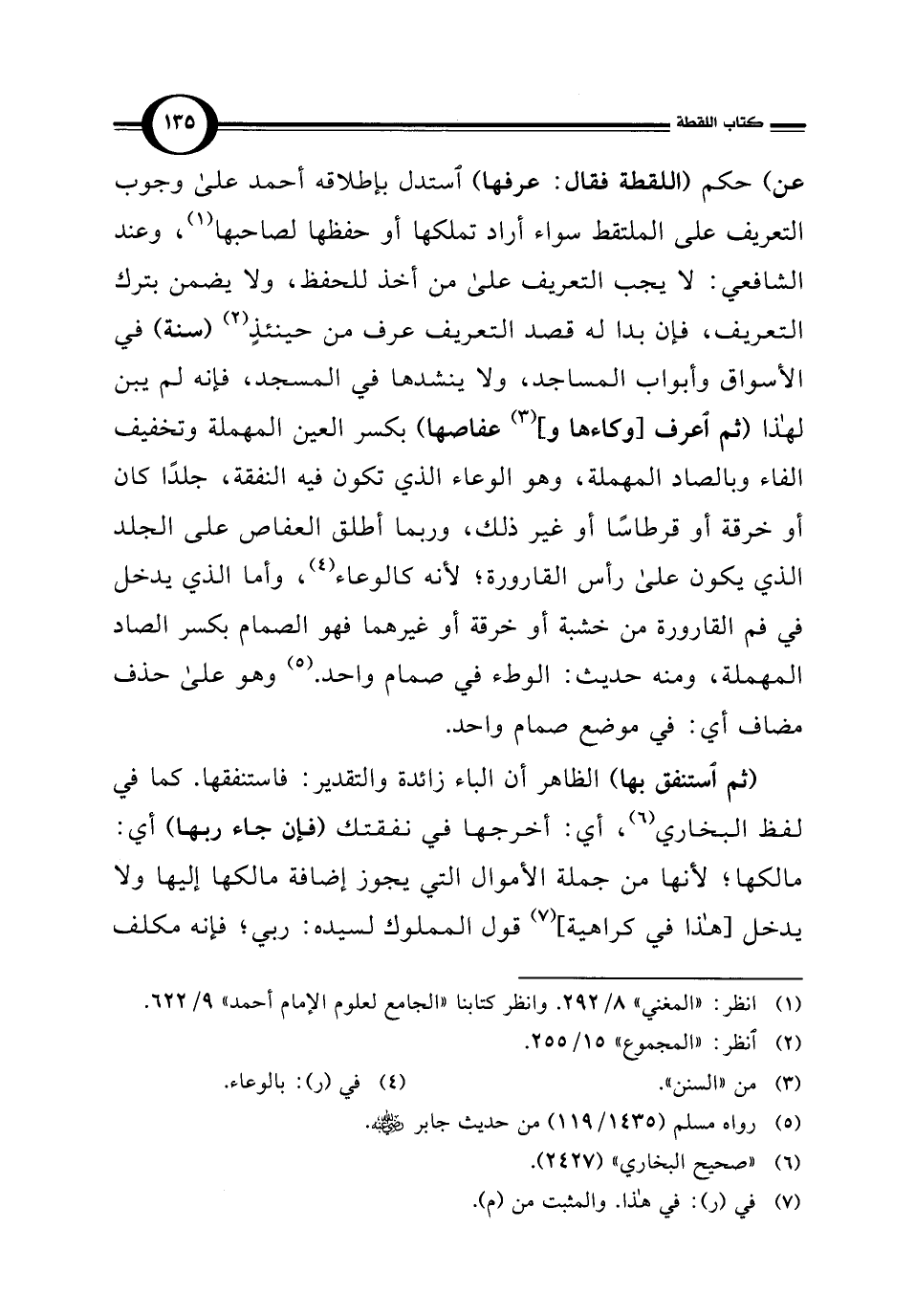 عن) حكم (اللقطة فقال: عرفها) استدل بإطلاقه أحمد على وجوب التعريف على الملتقط سواء أراد تملكها أو حفظها لصاحبها (¬1)، وعند الشافعي: لا يجب التعريف على من أخذ للحفظ، ولا يضمن بترك التعريف، فإن بدا له قصد التعريف عرف من حينئذٍ (¬2) (سنة) في الأسواق وأبواب المساجد، ولا ينشدها في المسجد، فإنه لم يبن لهذا (ثم اعرف [وكاءها و] (¬3) عفاصها) بكسر العين المهملة وتخفيف الفاء وبالصاد المهملة، وهو الوعاء الذي تكون فيه النفقة، جلدًا كان أو خرقة أو قرطاسًا أو غير ذلك، وربما أطلق العفاص على الجلد الذي يكون على رأس القارورة؛ لأنه كالوعاء (¬4)، وأما الذي يدخل في فم القارورة من خشبة أو خرقة أو غيرهما فهو الصمام بكسر الصاد المهملة، ومنه حديث: الوطء في صمام واحد. (¬5) وهو على حذف مضاف أي: في موضع صمام واحد.