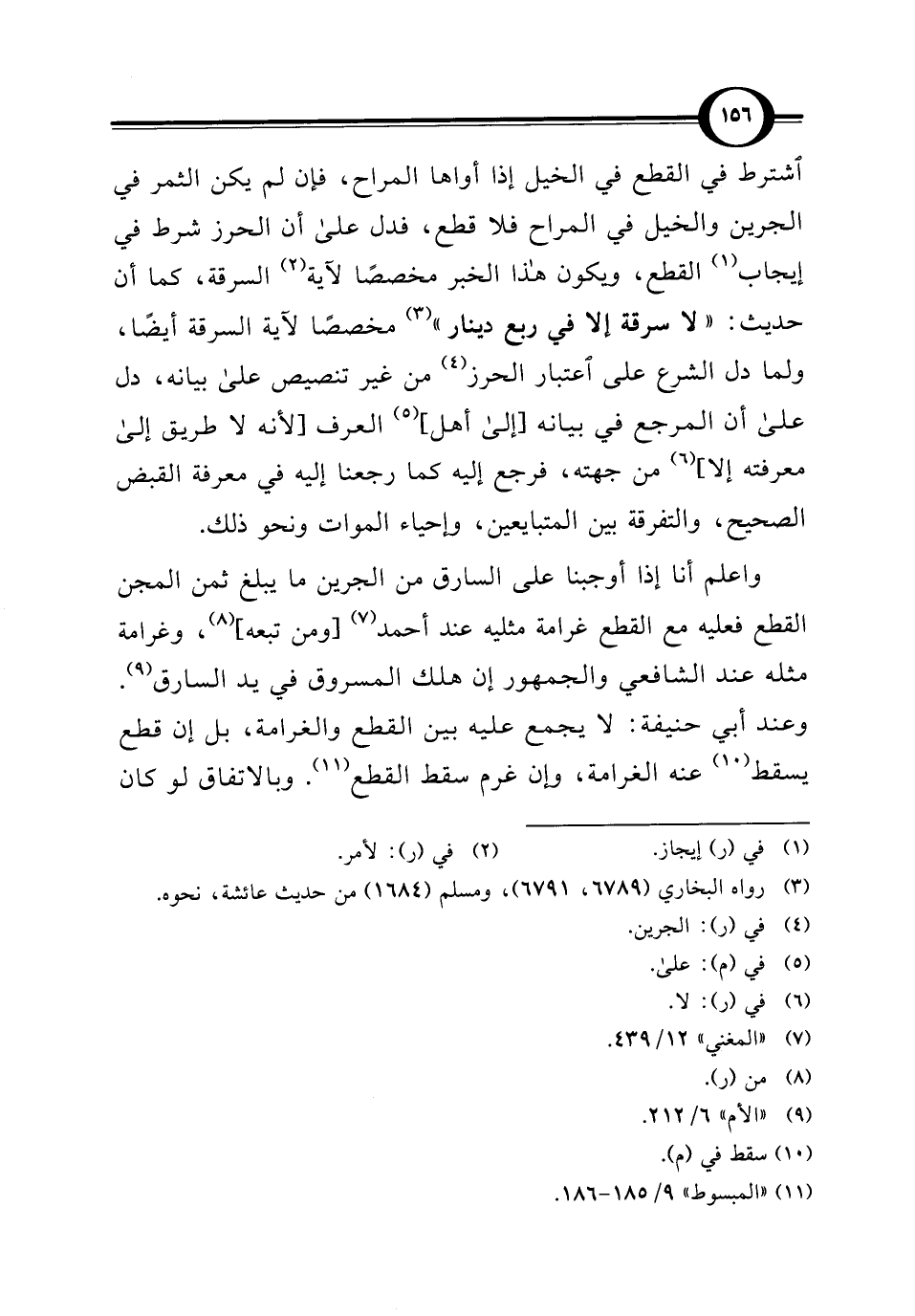 اشترط في القطع في الخيل إذا أواها المراح، فإن لم يكن الثمر في الجرين والخيل في المراح فلا قطع، فدل على أن الحرز شرط في إيجاب (¬1) القطع، ويكون هذا الخبر مخصصًا لآية (¬2) السرقة، كما أن حديث: "لا سرقة إلا في ربع دينار" (¬3) مخصصًا لآية السرقة أيضًا، ولما دل الشرع على اعتبار الحرز (¬4) من غير تنصيص على بيانه، دل على أن المرجع في بيانه [إلى أهل] (¬5) العرف [لأنه لا طريق إلى معرفته إلا] (¬6) من جهته، فرجع إليه كما رجعنا إليه في معرفة القبض الصحيح، والتفرقة بين المتبايعين، وإحياء الموات ونحو ذلك.