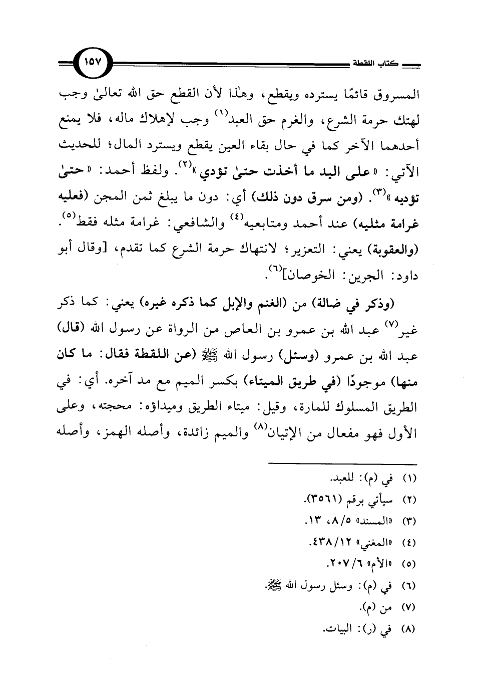 (وذكر في ضالة) من (الغنم والإبل كما ذكره غيره) يعني: كما ذكر غير (¬7) عبد الله بن عمرو بن العاص من الرواة عن رسول الله (قال) عبد الله بن عمرو (وسئل) رسول الله - صلى الله عليه وسلم - (عن اللقطة فقال: ما كان منها) موجودًا (في طريق الميتاء) بكسر الميم مع مد آخره. أي: في الطريق المسلوك للمارة، وقيل: ميتاء الطريق وميداؤه: محجته، وعلى الأول فهو مفعال من الإتيان (¬8) والميم زائدة، وأصله الهمز، وأصله