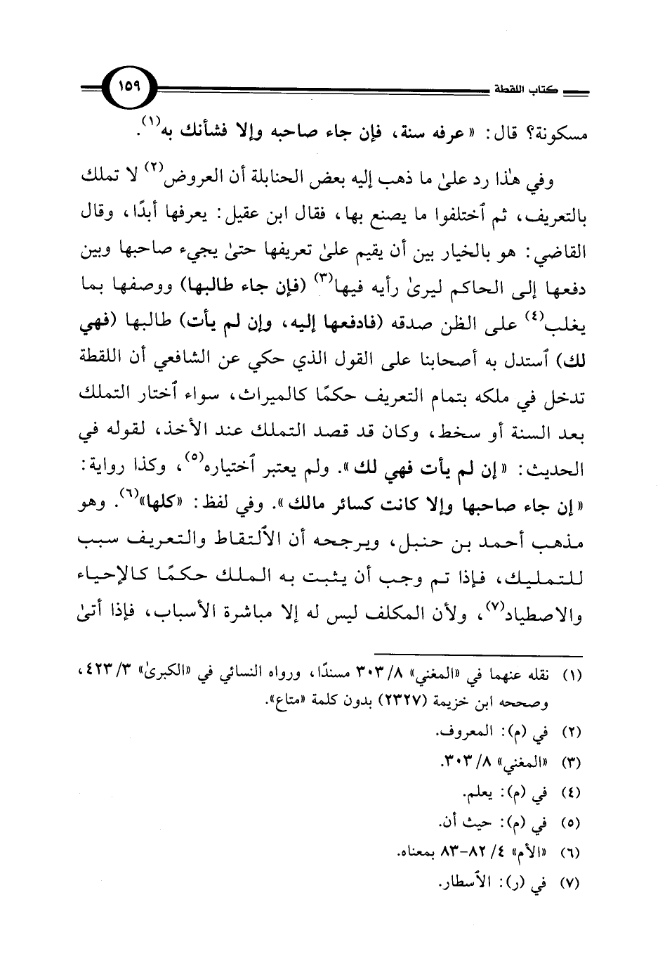 وفي هذا رد على ما ذهب إليه بعض الحنابلة أن العروض (¬2) لا تملك بالتعريف، ثم اختلفوا ما يصنع بها، فقال ابن عقيل: يعرفها أبدًا، وقال القاضي: هو بالخيار بين أن يقيم على تعريفها حتى يجيء صاحبها وبين دفعها إلى الحاكم ليرى رأيه فيها (¬3) (فإن جاء طالبها) ووصفها بما يغلب (¬4) على الظن صدقه (فادفعها إليه، وإن لم يأت) طالبها (فهي لك) استدل به أصحابنا على القول الذي حكي عن الشافعي أن اللقطة تدخل في ملكه بتمام التعريف حكمًا كالميراث، سواء اختار التملك بعد السنة أو سخط، وكان قد قصد التملك عند الأخذ، لقوله في الحديث: "إن لم يأت فهي لك". ولم يعتبر اختياره (¬5)، وكذا رواية: "إن جاء صاحبها وإلا كانت كسائر مالك". وفي لفظ: "كلها" (¬6). وهو مذهب أحمد بن حنبل، ويرجحه أن الالتقاط والتعريف سبب للتمليك، فإذا تم وجب أن يثبت به الملك حكمًا كالإحياء والاصطياد (¬7)، ولأن المكلف ليس له إلا مباشرة الأسباب، فإذا أتى