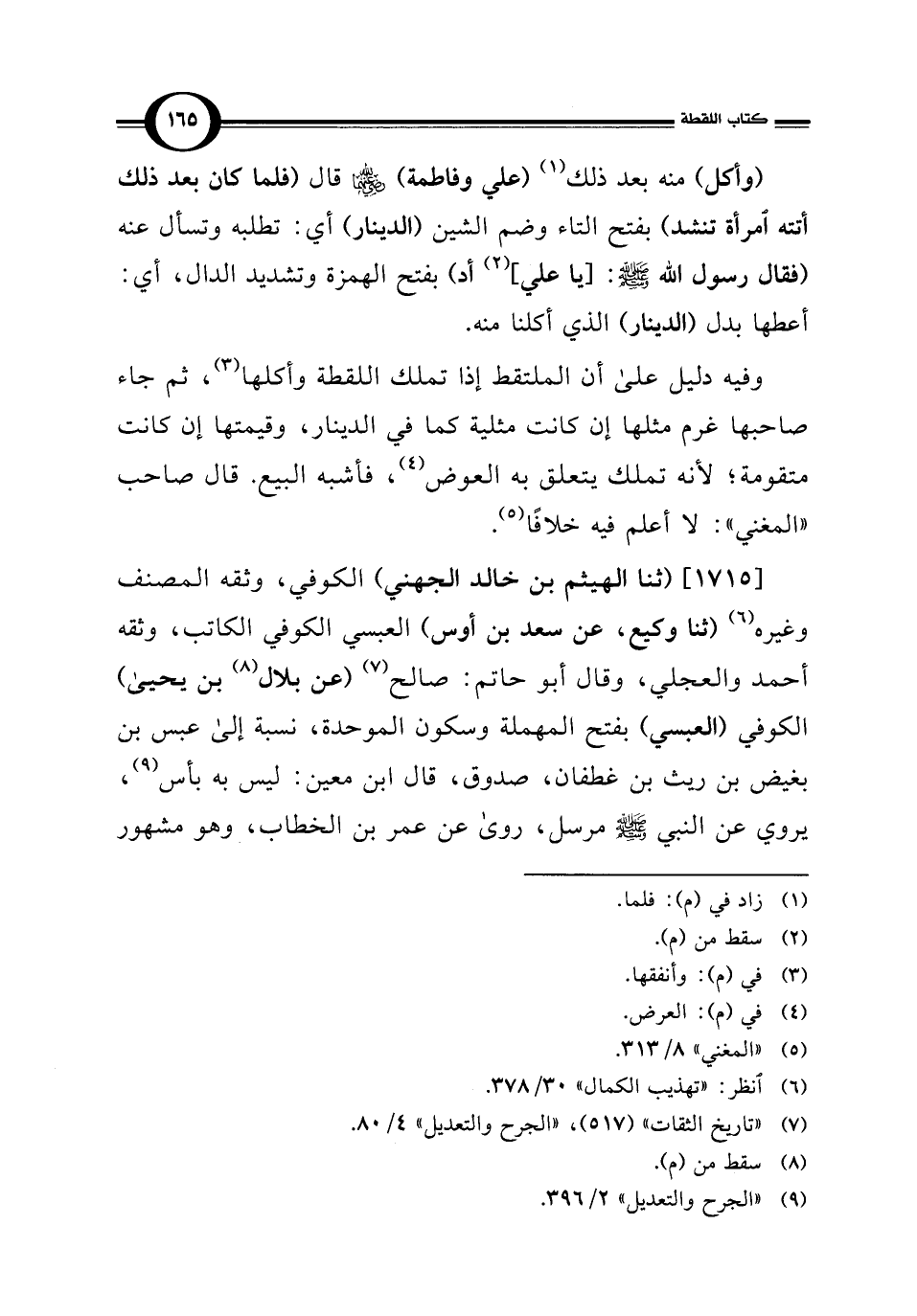 وفيه دليل على أن الملتقط إذا تملك اللقطة وأكلها (¬3)، ثم جاء صاحبها غرم مثلها إن كانت مثلية كما في الدينار، وقيمتها إن كانت متقومة؛ لأنه تملك يتعلق به العوض (¬4)، فأشبه البيع. قال صاحب "المغني": لا أعلم فيه خلافًا (¬5).