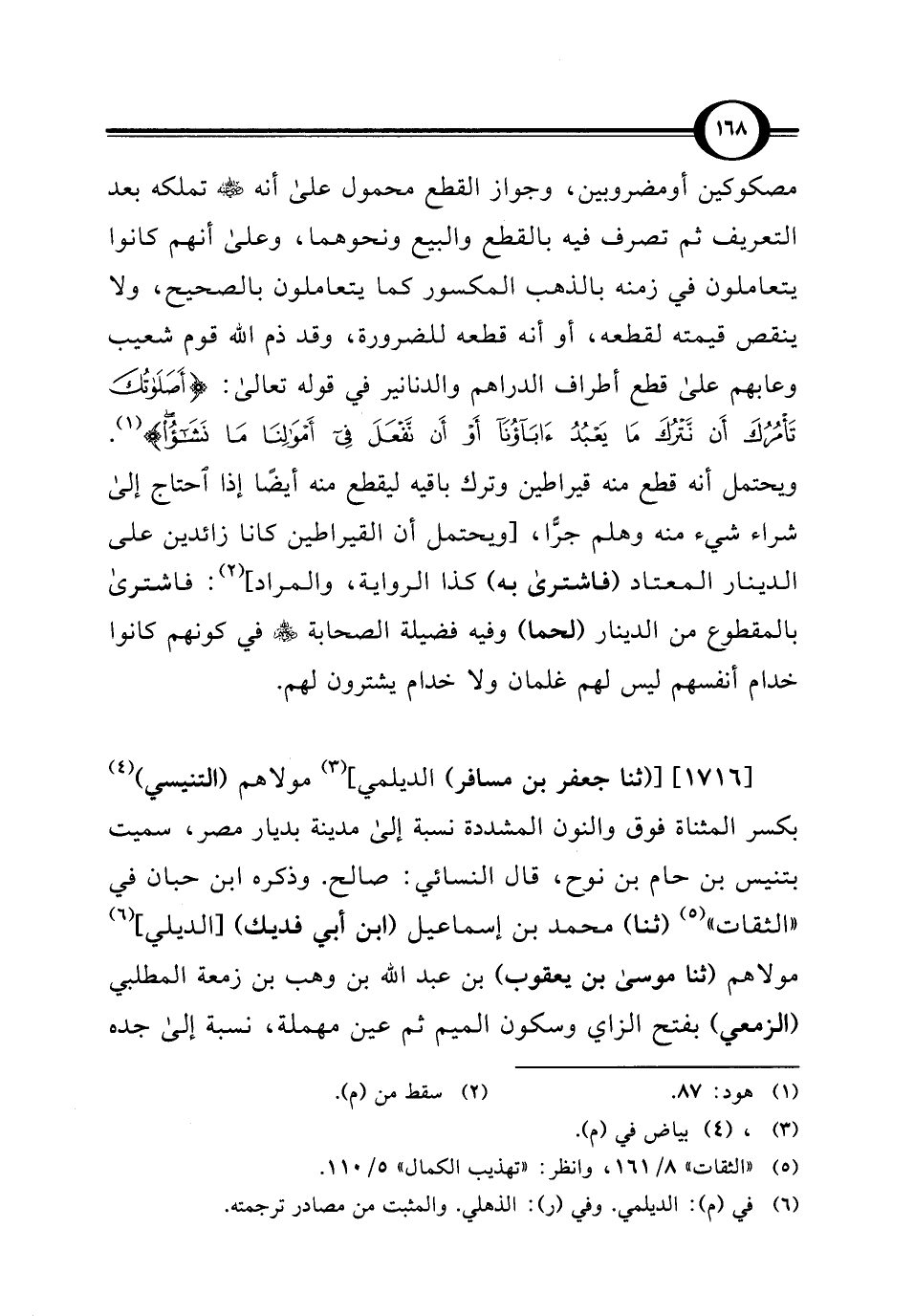 [1716] [(ثنا جعفر بن مسافر) الديلمي] (¬3) مولاهم (التنيسي) (¬4) بكسر المثناة فوق والنون المشددة نسبة إلى مدينة بديار مصر، سميت بتنيس بن حام بن نوح، قال النسائي: صالح. وذكره ابن حبان في "الثقات" (¬5) (ثنا) محمد بن إسماعيل (ابن أبي فديك) [الديلي] (¬6) مولاهم (ثنا موسى بن يعقوب) بن عبد الله بن وهب بن زمعة المطلبي (الزمعي) بفتح الزاي وسكون الميم ثم عين مهملة، نسبة إلى جده