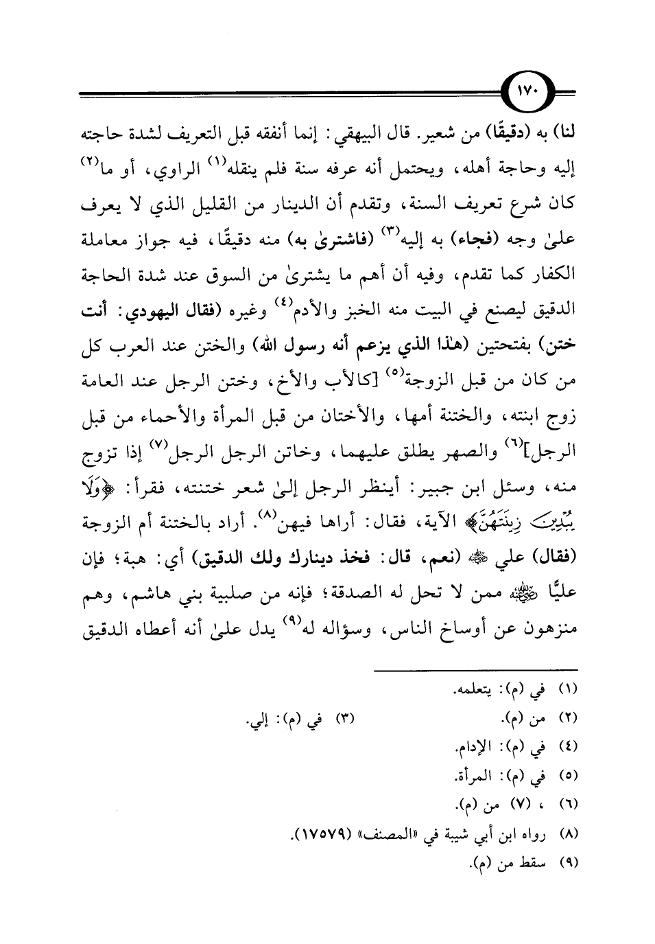 لنا) به (دقيقًا) من شعير. قال البيهقي: إنما أنفقه قبل التعريف لشدة حاجته إليه وحاجة أهله، ويحتمل أنه عرفه سنة فلم ينقله (¬1) الراوي، أو ما (¬2) كان شرع تعريف السنة، وتقدم أن الدينار من القليل الذي لا يعرف على وجه (فجاء) به إليه (¬3) (فاشترى به) منه دقيقًا، فيه جواز معاملة الكفار كما تقدم، وفيه أن أهم ما يشترى من السوق عند شدة الحاجة الدقيق ليصنع في البيت منه الخبز والأدم (¬4) وغيره (فقال اليهودي: أنت ختن) بفتحتين (هذا الذي يزعم أنه رسول الله) والختن عند العرب كل من كان من قبل الزوجة (¬5) [كالأب والأخ، وختن الرجل عند العامة زوج ابنته، والختنة أمها، والأختان من قبل المرأة والأحماء من قبل الرجل] (¬6) والصهر يطلق عليهما، وخاتن الرجل الرجل (¬7) إذا تزوج منه، وسئل ابن جبير: أينظر الرجل إلى شعر ختنته، فقرأ: {وَلَا يُبْدِينَ زِينَتَهُنَّ} الآية، فقال: أراها فيهن (¬8). أراد بالختنة أم الزوجة (فقال) علي - رضي الله عنه - (نعم، قال: فخذ دينارك ولك الدقيق) أي: هبة؛ فإن عليًّا - رضي الله عنه - ممن لا تحل له الصدقة؛ فإنه من صلبية بني هاشم، وهم منزهون عن أوساخ الناس، وسؤاله له (¬9) يدل على أنه أعطاه الدقيق