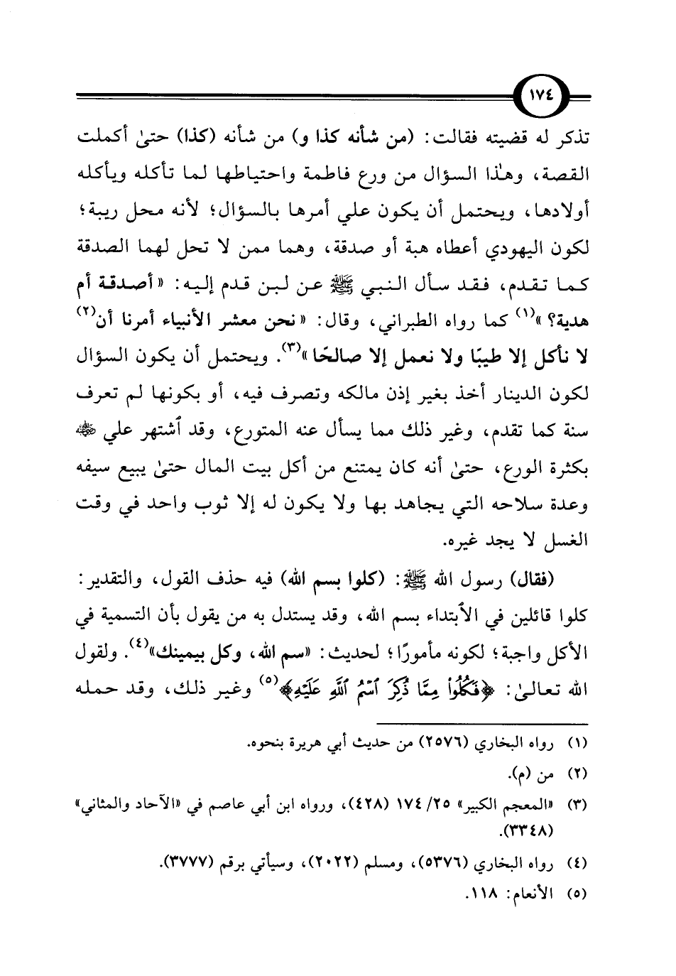 تذكر له قضيته فقالت: (من شأنه كذا و) من شأنه (كذا) حتى أكملت القصة، وهذا السؤال من ورع فاطمة واحتياطها لما تأكله ويأكله أولادها، ويحتمل أن يكون علي أمرها بالسؤال؛ لأنه محل ريبة؛ لكون اليهودي أعطاه هبة أو صدقة، وهما ممن لا تحل لهما الصدقة كما تقدم، فقد سأل النبي - صلى الله عليه وسلم - عن لبن قدم إليه: "أصدقة أم هدية؟ " (¬1) كما رواه الطبراني، وقال: "نحن معشر الأنبياء أمرنا أن (¬2) لا نأكل إلا طيبًا ولا نعمل إلا صالحًا" (¬3). ويحتمل أن يكون السؤال لكون الدينار أخذ بغير إذن مالكه وتصرف فيه، أو بكونها لم تعرف سنة كما تقدم، وغير ذلك مما يسأل عنه المتورع، وقد اشتهر علي - رضي الله عنه - بكثرة الورع، حتى أنه كان يمتنع من أكل بيت المال حتى يبيع سيفه وعدة سلاحه التي يجاهد بها ولا يكون له إلا ثوب واحد في وقت الغسل لا يجد غيره.