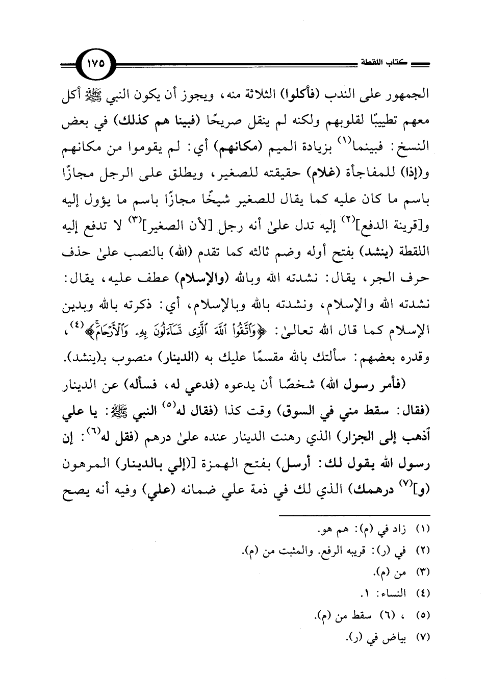 الجمهور على الندب (فأكلوا) الثلاثة منه، ويجوز أن يكون النبي - صلى الله عليه وسلم - أكل معهم تطييبًا لقلوبهم ولكنه لم ينقل صريحًا (فبينا هم كذلك) في بعض النسخ: فبينما (¬1) بزيادة الميم (مكانهم) أي: لم يقوموا من مكانهم و (إذا) للمفاجأة (غلام) حقيقته للصغير، ويطلق على الرجل مجازًا باسم ما كان عليه كما يقال للصغير شيخًا مجازًا باسم ما يؤول إليه و [قرينة الدفع] (¬2) إليه تدل على أنه رجل [لأن الصغير] (¬3) لا تدفع إليه اللقطة (ينشد) بفتح أوله وضم ثالثه كما تقدم (الله) بالنصب على حذف حرف الجر، يقال: نشدته الله وبالله (والإسلام) عطف عليه، يقال: نشدته الله والإسلام، ونشدته بالله وبالإسلام، أي: ذكرته بالله وبدين الإسلام كما قال الله تعالى: {وَاتَّقُوا اللَّهَ الَّذِي تَسَاءَلُونَ بِهِ وَالْأَرْحَامَ} (¬4)، وقدره بعضهم: سألتك بالله مقسمًا عليك به (الدينار) منصوب بـ (ينشد).