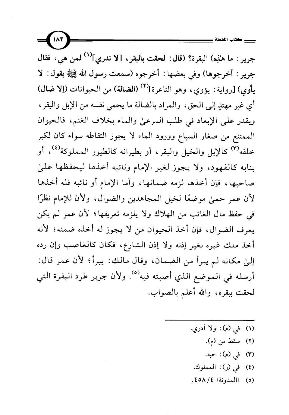 جرير: ما هذِه) البقرة؟ (قال: لحقت بالبقر، [لا ندري] (¬1) لمن هي، فقال جرير: أخرجوها) وفي بعضها: أخرجوه (سمعت رسول الله - صلى الله عليه وسلم - يقول: لا يأوي) [رواية: يؤوي، وهو الناعرة] (¬2) (الضالة) من الحيوانات (إلا ضال) أي غير مهتدٍ إلى الحق، والمراد بالضالة ما يحمي نفسه من الإبل والبقر، ويقدر على الإبعاد في طلب المرعى والماء بخلاف الغنم، فالحيوان الممتنع من صغار السباع وورود الماء لا يجوز التقاطه سواء كان لكبر خلقه (¬3) كالإبل والخيل والبقر، أو بطيرانه كالطيور المملوكة (¬4)، أو بنابه كالفهود، ولا يجوز لغير الإمام ونائبه أخذها ليحفظها على صاحبها، فإن أخذها لزمه ضمانها، وأما الإمام أو نائبه فله أخذها لأن عمر حمى موضعًا لخيل المجاهدين والضوال، ولأن للإمام نظرًا في حفظ مال الغائب من الهلاك ولا يلزمه تعريفها؛ لأن عمر لم يكن يعرف الضوال، فإن أخذ الحيوان من لا يجوز له أخذه ضمنه؛ لأنه أخذ ملك غيره بغير إذنه ولا إذن الشارع، فكان كالغاصب وإن رده إلى مكانه لم يبرأ من الضمان، وقال مالك: يبرأ؛ لأن عمر قال: أرسله في الموضع الذي أصبته فيه (¬5). ولأن جرير طرد البقرة التي لحقت ببقره، والله أعلم بالصواب.