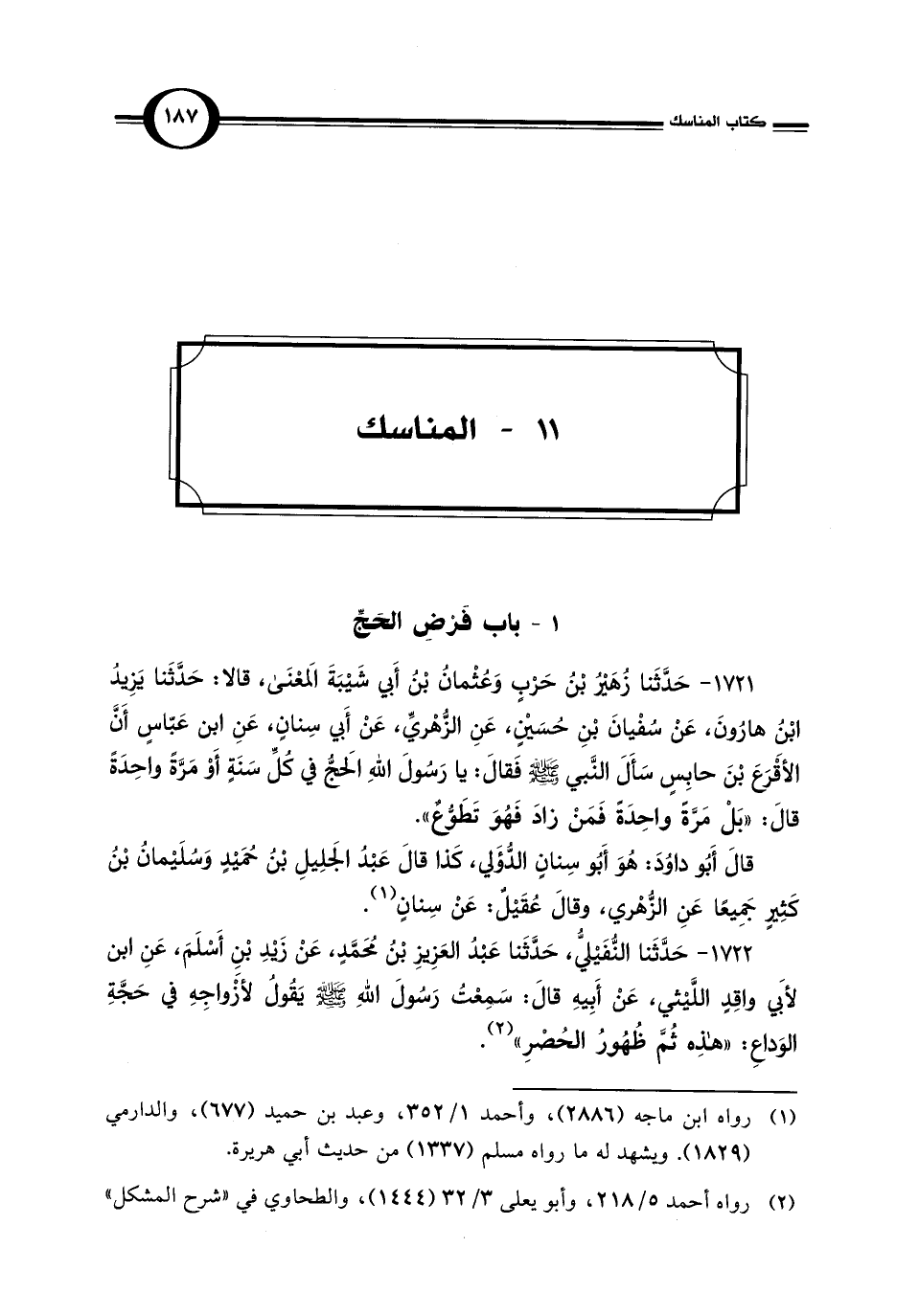 1721 - حَدَّثَنا زُهَيْرُ بْنُ حَرْبٍ وَعُثْمانُ بْنُ أَبي شَيْبَةَ المَعْنَى، قالا: حَدَّثَنا يَزِيدُ بْنُ هارُونَ، عَنْ سُفْيانَ بْنِ حُسَيْنٍ، عَنِ الزُّهْريِّ، عَنْ أَبي سِنانٍ، عَنِ ابن عَبّاسٍ أَنَّ الأَقْرَعَ بْنَ حابِسٍ سَأَلَ النَّبي - صلى الله عليه وسلم - فَقَالَ: يا رَسُولَ اللهِ الحَجُّ في كُلِّ سَنَةٍ أَوْ مَرَّةً واحِدَةً قَالَ: "بَلْ مَرَّةً واحِدَةً فَمَنْ زادَ فَهُوَ تَطَوُّعٌ".