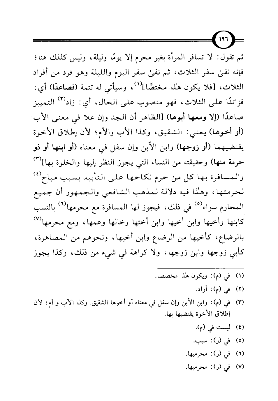 ثم تقول: لا تسافر المرأة بغير محرم إلا يومًا وليلة، وليس كذلك هنا؛ فإنه نفى سفر الثلاث، ثم نفى سفر اليوم والليلة وهو فرد من أفراد الثلاث، [فلا يكون هذا مختصًّا] (¬1)، وسيأتي له تتمة (فصاعدًا) أي: فزائدًا على الثلاث، فهو منصوب على الحال، أي: زاد (¬2) التمييز صاعدًا (إلا ومعها أبوها) [الظاهر أن الجد وإن علا في معنى الأب (أو أخوها) يعني: الشقيق، وكذا الأب والأم؛ لأن إطلاق الأخوة يقتضيهما (أو زوجها) وابن الابن وإن سفل في معناه (أو ابنها أو ذو حرمة منها) وحقيقته من النساء التي يجوز النظر إليها والخلوة بها] (¬3) والمسافرة بها كل من حرم نكاحها على التأبيد بسبب مباح (¬4) لحرمتها، وهذا فيه دلالة لمذهب الشافعي والجمهور أن جميع المحارم سواء (¬5) في ذلك، فيجوز لها المسافرة مع محرمها (¬6) بالنسب كابنها وأخيها وابن أخيها وابن أختها وخالها وعمها، ومع محرمها (¬7) بالرضاع، كأخيها من الرضاع وابن أخيها، ونحوهم من المصاهرة، كأبي زوجها وابن زوجها، ولا كراهة في شيء من ذلك، وكذا يجوز