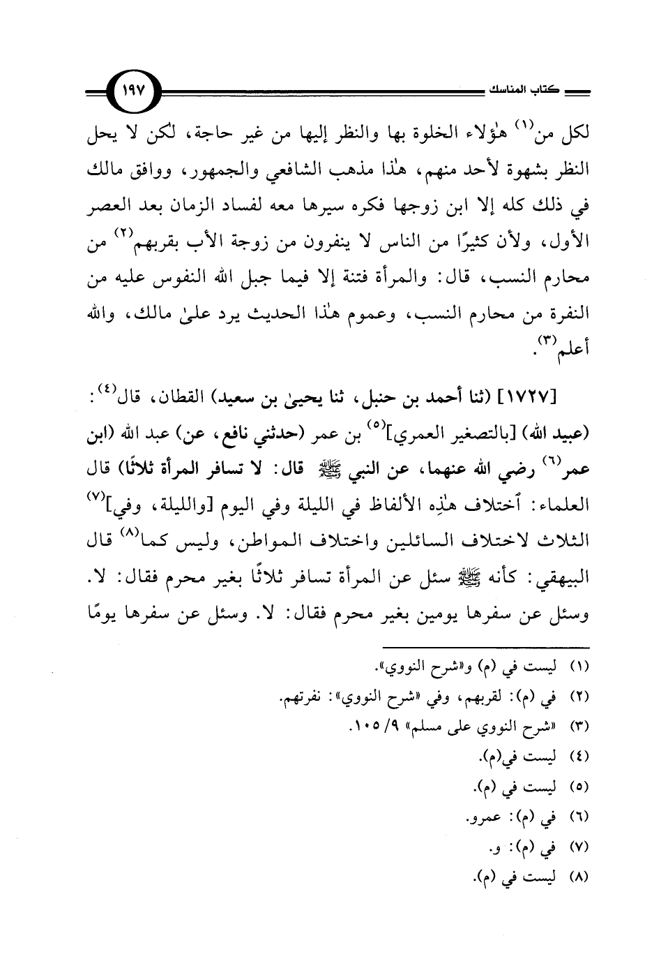 [1727] (ثنا أحمد بن حنبل، ثنا يحيى بن سعيد) القطان، قال (¬4): (عبيد الله) [بالتصغير العمري] (¬5) بن عمر (حدثني نافع، عن) عبد الله (ابن عمر (¬6) رضي الله عنهما، عن النبي - صلى الله عليه وسلم - قال: لا تسافر المرأة ثلاثًا) قال العلماء: اختلاف هذِه الألفاظ في الليلة وفي اليوم [والليلة، وفي] (¬7) الثلاث لاختلاف السائلين واختلاف المواطن، وليس كما (¬8) قال البيهقي: كأنه - صلى الله عليه وسلم - سئل عن المرأة تسافر ثلاثًا بغير محرم فقال: لا. وسئل عن سفرها يومين بغير محرم فقال: لا. وسئل عن سفرها يومًا