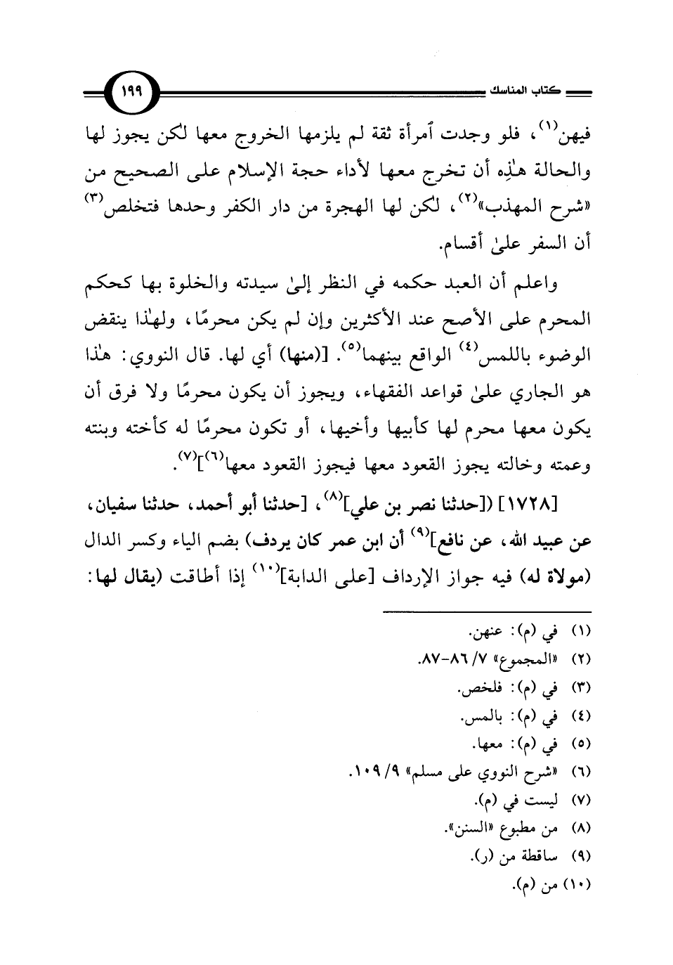 [1728] ([حدثنا نصر بن علي] (¬8)، [حدثنا أبو أحمد، حدثنا سفيان، عن عبيد الله، عن نافع] (¬9) أن ابن عمر كان يردف) بضم الياء وكسر الدال (مولاة له) فيه جواز الإرداف [على الدابة] (¬10) إذا أطاقت (يقال لها: