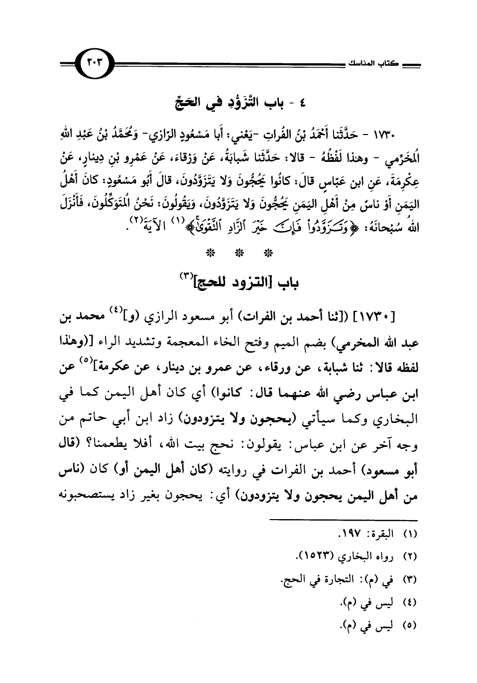 [1730] ([ثنا أحمد بن الفرات) أبو مسعود الرازي (و] (¬4) محمد بن عبد الله المخرمي) بضم الميم وفتح الخاء المعجمة وتشديد الراء [(وهذا لفظه قالا: ثنا شبابة، عن ورقاء، عن عمرو بن دينار، عن عكرمة] (¬5) عن ابن عباس رضي الله عنهما قال: كانوا) أي كان أهل اليمن كما في البخاري وكما سيأتي (يحجون ولا يتزودون) زاد ابن أبي حاتم من وجه آخر عن ابن عباس: يقولون: نحج بيت الله، أفلا يطعمنا؟ (قال أبو مسعود) أحمد بن الفرات في روايته (كان أهل اليمن أو) كان (ناس من أهل اليمن يحجون ولا يتزودون) أي: يحجون بغير زاد يستصحبونه