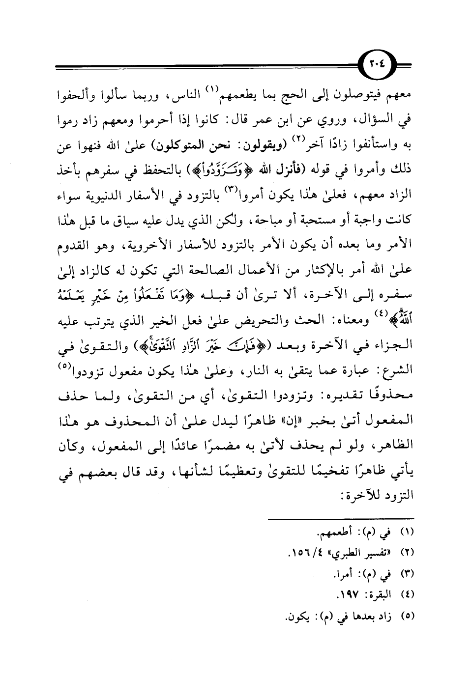 معهم فيتوصلون إلى الحج بما يطعمهم (¬1) الناس، وربما سألوا وألحفوا في السؤال، وروي عن ابن عمر قال: كانوا إذا أحرموا ومعهم زاد رموا به واستأنفوا زادًا آخر (¬2) (ويقولون: نحن المتوكلون) على الله فنهوا عن ذلك وأمروا في قوله (فأنزل الله {وَتَزَوَّدُوا}) بالتحفظ في سفرهم بأخذ الزاد معهم، فعلى هذا يكون أمروا (¬3) بالتزود في الأسفار الدنيوية سواء كانت واجبة أو مستحبة أو مباحة، ولكن الذي يدل عليه سياق ما قبل هذا الأمر وما بعده أن يكون الأمر بالتزود للأسفار الأخروية، وهو القدوم على الله أمر بالإكثار من الأعمال الصالحة التي تكون له كالزاد إلى سفره إلى الآخرة، ألا ترى أن قبله {وَمَا تَفْعَلُوا مِنْ خَيْرٍ يَعْلَمْهُ اللَّهُ} (¬4) ومعناه: الحث والتحريض على فعل الخير الذي يترتب عليه الجزاء في الآخرة وبعد ({فَإِنَّ خَيْرَ الزَّادِ التَّقْوَى}) والتقوى في الشرع: عبارة عما يتقى به النار، وعلى هذا يكون مفعول تزودوا (¬5) محذوفًا تقديره: وتزودوا التقوى، أي من التقوى، ولما حذف المفعول أتى بخبر "إن" ظاهرًا ليدل على أن المحذوف هو هذا الظاهر، ولو لم يحذف لأتى به مضمرًا عائدًا إلى المفعول، وكأن يأتي ظاهرًا تفخيمًا للتقوى وتعظيمًا لشأنها، وقد قال بعضهم في التزود للآخرة: