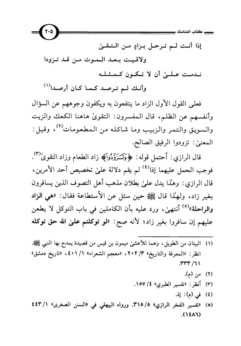 قال الرازي: احتمل قوله: {وَتَزَوَّدُوا} زاد الطعام وزاد التقوى (¬3). فوجب الحمل عليهما إذا (¬4) لم يقم دلالة على تخصيص أحد الأمرين، قال الرازي: وهذا يدل على بطلان مذهب أهل التصوف الذين يسافرون بغير زاد، ولهذا قال - صلى الله عليه وسلم - حين سئل عن الاستطاعة فقال: "هي الزاد والراحلة" (¬5) انتهى، ورد عليه بأن الكاملين في باب التوكل لا يطعن عليهم إن سافروا بغير زاد؛ لأنه صح: "لو توكلتم على الله حق توكله