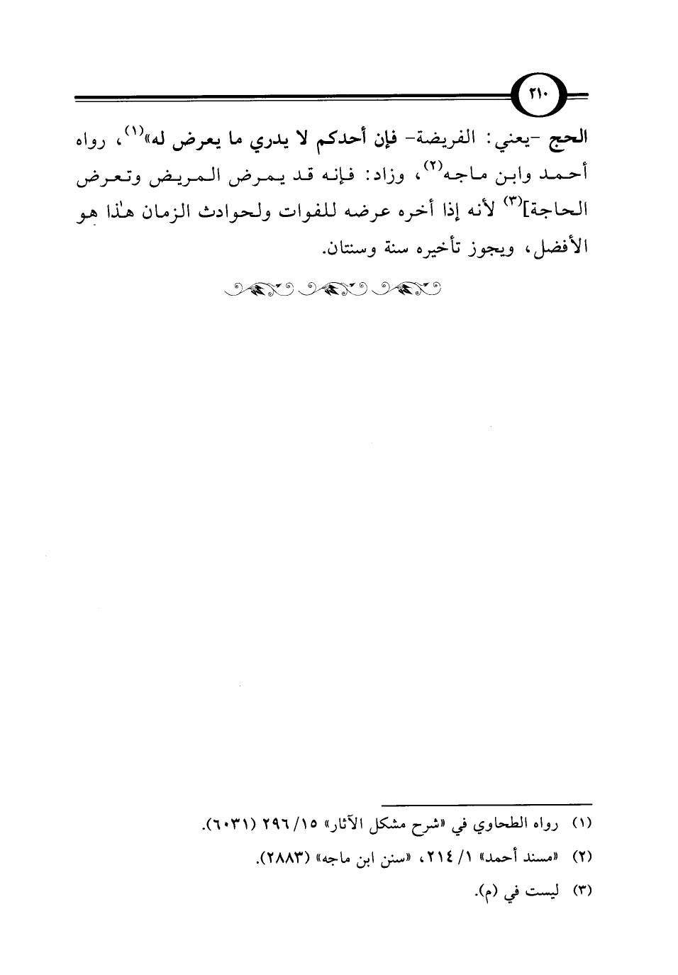 الحج - يعني: الفريضة - فإن أحدكم لا يدري ما يعرض له" (¬1)، رواه أحمد وابن ماجه (¬2)، وزاد: فإنه قد يمرض المريض وتعرض الحاجة] (¬3) لأنه إذا أخره عرضه للفوات ولحوادث الزمان هذا هو الأفضل، ويجوز تأخيره سنة وسنتان.