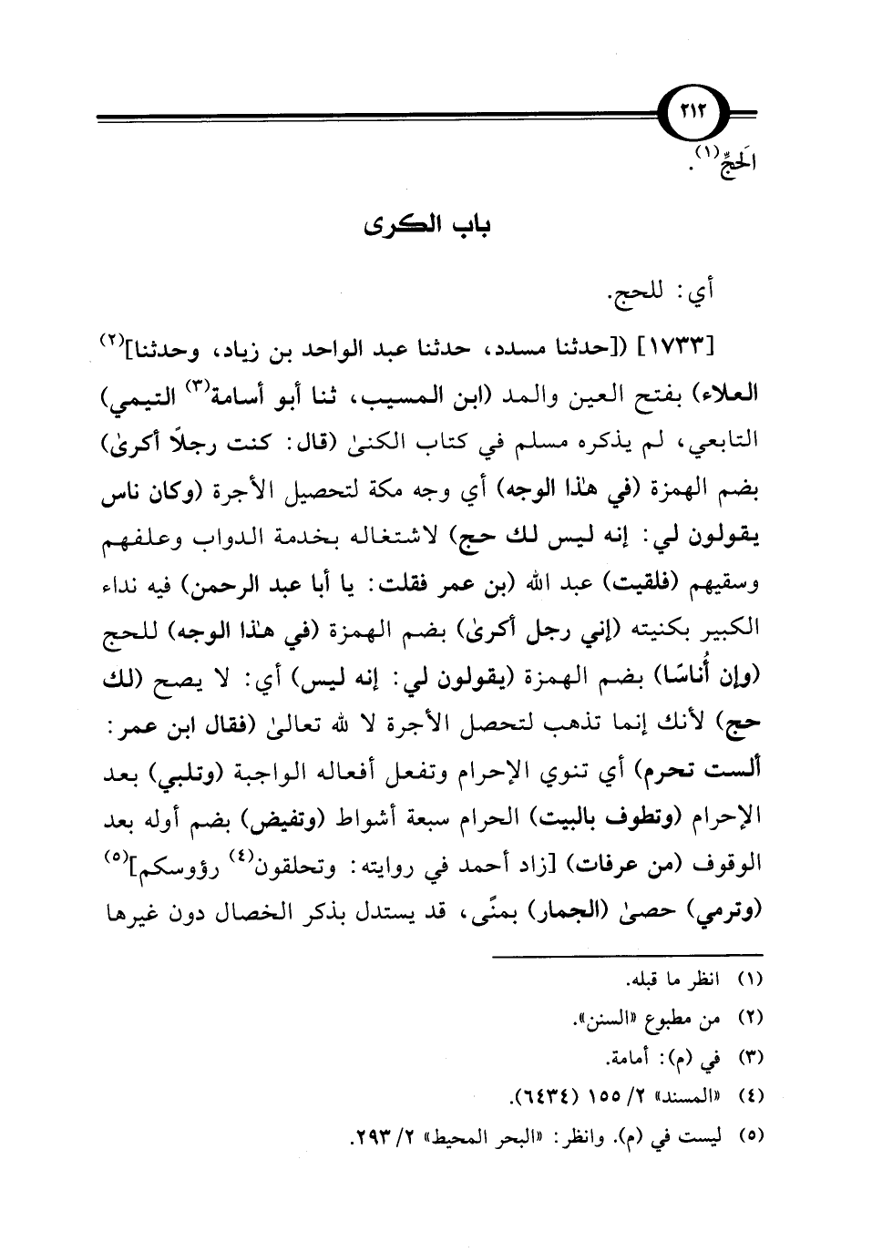 [1733] ([حدثنا مسدد، حدثنا عبد الواحد بن زياد، وحدثنا] (¬2) العلاء) بفتح العين والمد (ابن المسيب، ثنا أبو أسامة (¬3) التيمي) التابعي، لم يذكره مسلم في كتاب الكنى (قال: كنت رجلًا أكرى) بضم الهمزة (في هذا الوجه) أي وجه مكة لتحصيل الأجرة (وكان ناس يقولون لي: إنه ليس لك حج) لاشتغاله بخدمة الدواب وعلفهم وسقيهم (فلقيت) عبد الله (بن عمر فقلت: يا أبا عبد الرحمن) فيه نداء الكبير بكنيته (إني رجل أكرى) بضم الهمزة (في هذا الوجه) للحج (وإن أُناسًا) بضم الهمزة (يقولون لي: إنه ليس) أي: لا يصح (لك حج) لأنك إنما تذهب لتحصل الأجرة لا لله تعالى (فقال ابن عمر: ألست تحرم) أي تنوي الإحرام وتفعل أفعاله الواجبة (وتلبي) بعد الإحرام (وتطوف بالبيت) الحرام سبعة أشواط (وتفيض) بضم أوله بعد الوقوف (من عرفات) [زاد أحمد في روايته: وتحلقون (¬4) رؤوسكم] (¬5) (وترمي) حصى (الجمار) بمنًى، قد يستدل بذكر الخصال دون غيرها