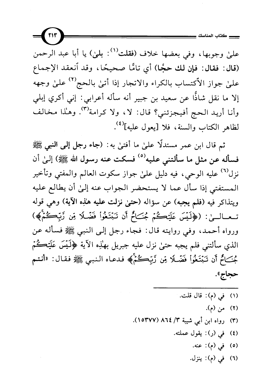 ثم قال ابن عمر مستدلًا على ما أفتى به: (جاء رجل إلى النبي - صلى الله عليه وسلم - فسأله عن مثل ما سألتني عليه (¬5) فسكت عنه رسول الله - صلى الله عليه وسلم -) إلى أن نزل (¬6) عليه الوحي، فيه دليل على جواز سكوت العالم والمفتي وتأخير المستفتي إذا سأل عما لا يستحضر الجواب عنه إلى أن يطالع عليه ويتذاكر فيه (فلم يجبه) عن سؤاله (حتى نزلت عليه هذِه الآية) وهي قوله تعالى: ({لَيْسَ عَلَيْكُمْ جُنَاحٌ أَنْ تَبْتَغُوا فَضْلًا مِنْ رَبِّكُمْ}) ورواه أحمد، وفي روايته قال: فجاء رجل إلى النبي - صلى الله عليه وسلم - فسأله عن الذي سألتني فلم يجبه حتى نزل عليه جبريل بهذِه الآية {لَيْسَ عَلَيْكُمْ جُنَاحٌ أَنْ تَبْتَغُوا فَضْلًا مِنْ رَبِّكُمْ} فدعاه النبي - صلى الله عليه وسلم - فقال: "أنتم حجاج".