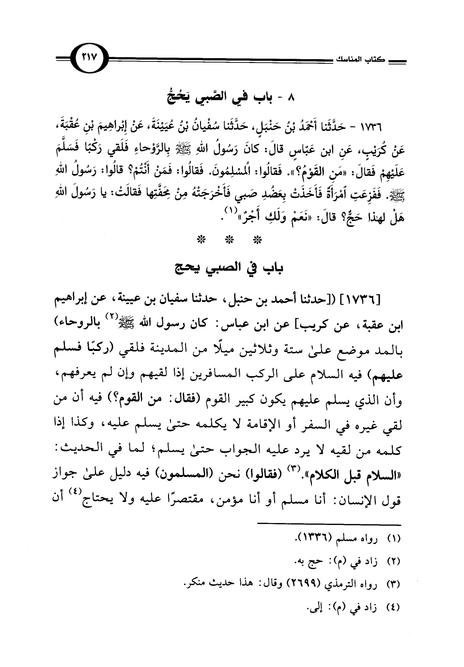 1736 - حَدَّثَنا أَحْمَدُ بْنُ حَنْبَلٍ، حَدَّثَنا سُفْيانُ بْن عُيَيْنَةَ، عَنْ إِبْراهِيمَ بْنِ عُقْبَةَ، عَنْ كُرَيْبٍ، عَنِ ابن عَبَّاسٍ قَالَ: كَانَ رَسُولُ اللهِ - صلى الله عليه وسلم - بِالرَّوْحاءِ فَلَقي رَكْبًا فَسَلَّمَ عَلَيْهِمْ فَقَالَ: "مَنِ القَوْمُ؟ ". فَقَالُوا: المُسْلِمُونَ. فَقَالُوا: فَمَنْ أَنْتُمْ؟ قَالُوا: رَسُولُ اللهِ - صلى الله عليه وسلم -. فَفَزِعَتِ امْرَأَةٌ فَأَخَذَتْ بِعَضُدِ صَبي فَأَخْرَجَتْهُ مِنْ مِحَفَّتِها فَقَالَتْ: يا رَسُولَ اللهِ هَلْ لهذا حَجٌّ؟ قَالَ: "نَعَمْ وَلَكِ أَجْرٌ" (¬1).