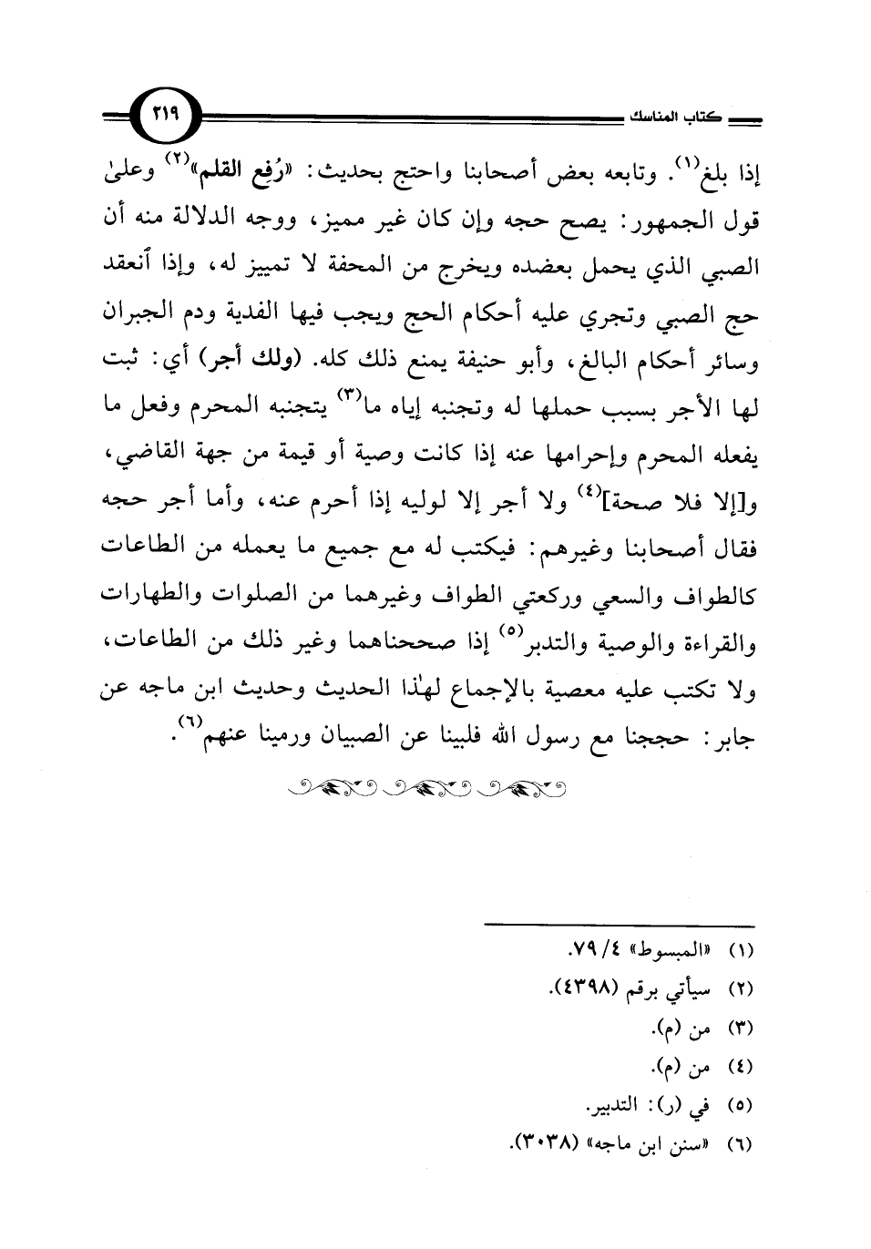 إذا بلغ (¬1). وتابعه بعض أصحابنا واحتج بحديث: "رُفِع القلم" (¬2) وعلى قول الجمهور: يصح حجه وإن كان غير مميز، ووجه الدلالة منه أن الصبي الذي يحمل بعضده ويخرج من المحفة لا تمييز له، وإذا انعقد حج الصبي وتجري عليه أحكام الحج ويجب فيها الفدية ودم الجبران وسائر أحكام البالغ، وأبو حنيفة يمنع ذلك كله. (ولك أجر) أي: ثبت لها الأجر بسبب حملها له وتجنبه إياه ما (¬3) يتجنبه المحرم وفعل ما يفعله المحرم وإحرامها عنه إذا كانت وصية أو قيمة من جهة القاضي، و [إلا فلا صحة] (¬4) ولا أجر إلا لوليه إذا أحرم عنه، وأما أجر حجه فقال أصحابنا وغيرهم: فيكتب له مع جميع ما يعمله من الطاعات كالطواف والسعي وركعتي الطواف وغيرهما من الصلوات والطهارات والقراءة والوصية والتدبر (¬5) إذا صححناهما وغير ذلك من الطاعات، ولا تكتب عليه معصية بالإجماع لهذا الحديث وحديث ابن ماجه عن جابر: حججنا مع رسول الله فلبينا عن الصبيان ورمينا عنهم (¬6).