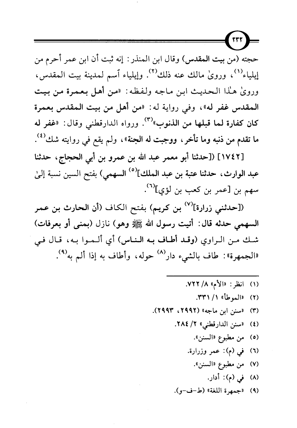 حجته (من بيت المقدس) وقال ابن المنذر: إنه ثبت أن ابن عمر أحرم من إيلياء (¬1)، وروى مالك عنه ذلك (¬2). وإيلياء اسم لمدينة بيت المقدس، وروى هذا الحديث ابن ماجه ولفظه: "من أهل بعمرة من بيت المقدس غفر له"، وفي رواية له: "من أهل من بيت المقدس بعمرة كان كفارة لما قبلها من الذنوب" (¬3). ورواه الدارقطني وقال: "غفر له ما تقدم من ذنبه وما تأخر، ووجبت له الجنة"، ولم يقع في روايته شك (¬4).