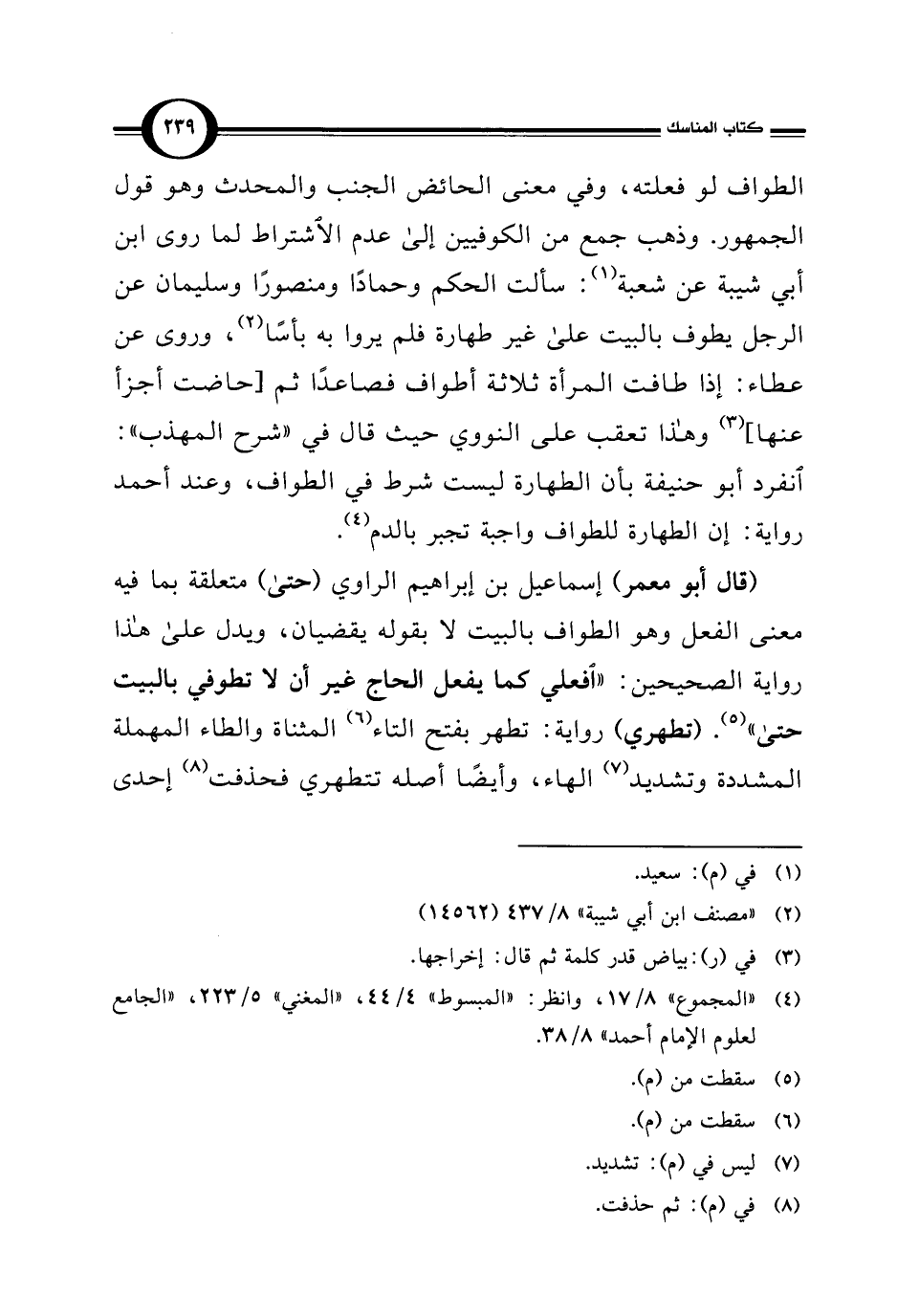الطواف لو فعلته، وفي معنى الحائض الجنب والمحدث وهو قول الجمهور. وذهب جمع من الكوفيين إلى عدم الاشتراط لما روى ابن أبي شيبة عن شعبة (¬1): سألت الحكم وحمادًا ومنصورًا وسليمان عن الرجل يطوف بالبيت على غير طهارة فلم يروا به بأسًا (¬2)، وروى عن عطاء: إذا طافت المرأة ثلاثة أطواف فصاعدًا ثم [حاضت أجزأ عنها] (¬3) وهذا تعقب على النووي حيث قال في "شرح المهذب": انفرد أبو حنيفة بأن الطهارة ليست شرط في الطواف، وعند أحمد رواية: إن الطهارة للطواف واجبة تجبر بالدم (¬4).