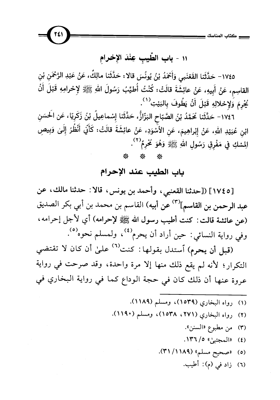 1745 - حَدَّثَنا القَعْنَبي وَأَحْمَدُ بْنُ يُونُسَ قالا: حَدَّثَنا مالِكٌ، عَنْ عَبْدِ الرَّحْمَنِ بْنِ القاسِمِ، عَنْ أَبِيهِ، عَنْ عَائِشَةَ قَالَتْ: كُنْتُ أُطيِّبُ رَسُولَ اللهِ - صلى الله عليه وسلم - لإِحْرامِهِ قَبْلَ أَنْ يُحْرِمَ وَلإِحْلالِهِ قَبْلَ أَنْ يَطُوفَ بِالبَيْتِ (¬1).