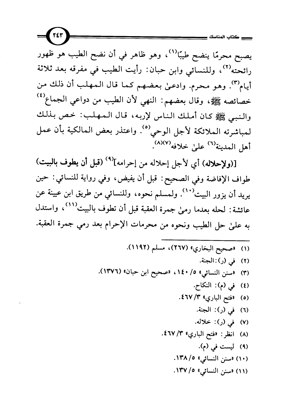 [(ولإحلاله) أي لأجل إحلاله من إحرامه] (¬9) (قبل أن يطوف بالبيت) طواف الإفاضة وفي الصحيح: قبل أن يفيض، وفي رواية للنسائي: حين يريد أن يزور البيت (¬10). ولمسلم نحوه، وللنسائي من طريق ابن عيينة عن عائشة: لحله بعدما رمى جمرة العقبة قبل أن تطوف بالبيت (¬11)، واستدل به على حل الطيب ونحوه من محرمات الإحرام بعد رمي جمرة العقبة.