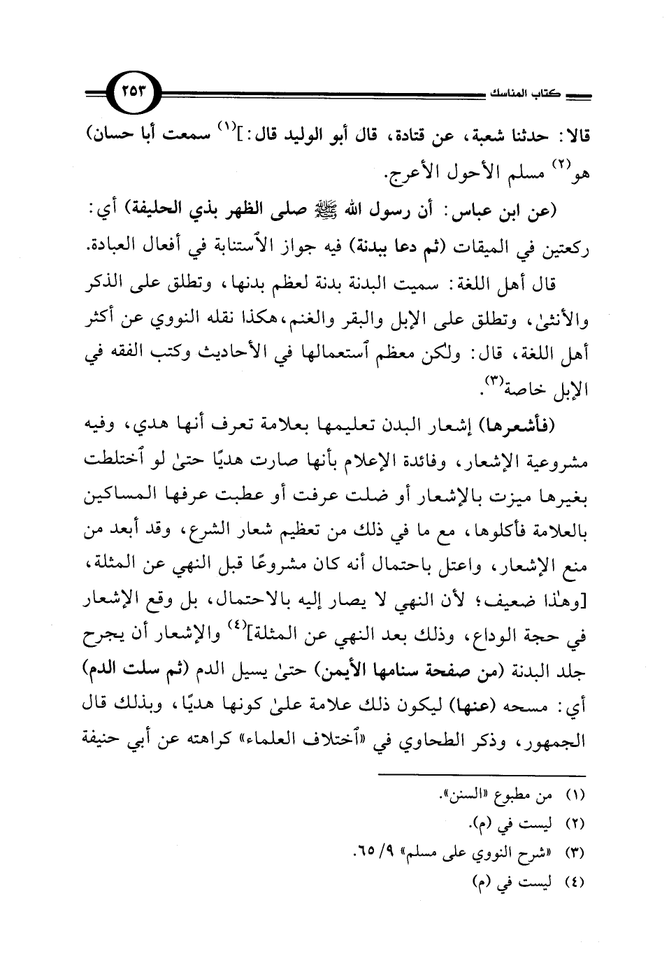 (فأشعرها) إشعار البدن تعليمها بعلامة تعرف أنها هدي، وفيه مشروعية الإشعار، وفائدة الإعلام بأنها صارت هديًا حتى لو اختلطت بغيرها ميزت بالإشعار أو ضلت عرفت أو عطبت عرفها المساكين بالعلامة فأكلوها، مع ما في ذلك من تعظيم شعار الشرع، وقد أبعد من منع الإشعار، واعتل باحتمال أنه كان مشروعًا قبل النهي عن المثلة، [وهذا ضعيف؛ لأن النهي لا يصار إليه بالاحتمال، بل وقع الإشعار في حجة الوداع، وذلك بعد النهي عن المثلة] (¬4) والإشعار أن يجرح جلد البدنة (من صفحة سنامها الأيمن) حتى يسيل الدم (ثم سلت الدم) أي: مسحه (عنها) ليكون ذلك علامة على كونها هديًا، وبذلك قال الجمهور، وذكر الطحاوي في "اختلاف العلماء" كراهته عن أبي حنيفة