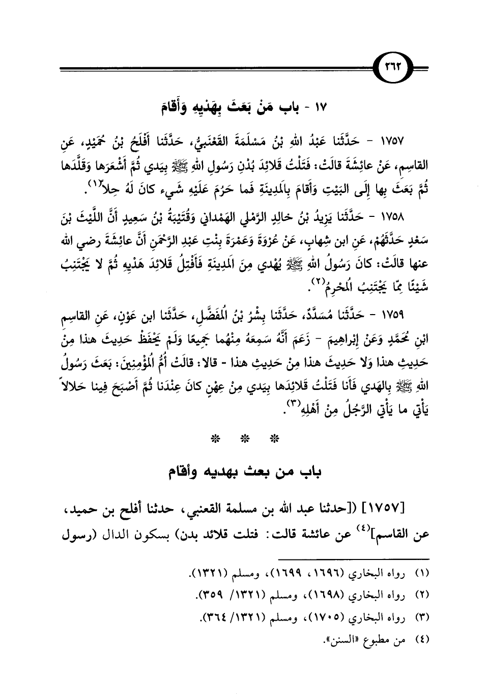 1757 - حَدَّثَنا عَبْدُ اللهِ بْنُ مَسْلَمَةَ القَعْنَبيُّ، حَدَّثَنا أَفْلَحُ بْنُ حُمَيْدٍ، عَنِ القاسِمِ، عَنْ عَائِشَةَ قَالَتْ: فَتَلْتُ قَلائِدَ بُدْنِ رَسُولِ اللهِ - صلى الله عليه وسلم - بِيَدي ثُمَّ أَشْعَرَها وَقَلَّدَها ثُمَّ بَعَثَ بِها إِلَى البَيْتِ وَأَقامَ بِالمَدِينَةِ فَما حَرُمَ عَلَيْهِ شَيء كَانَ لَهُ حِلّا (¬1).