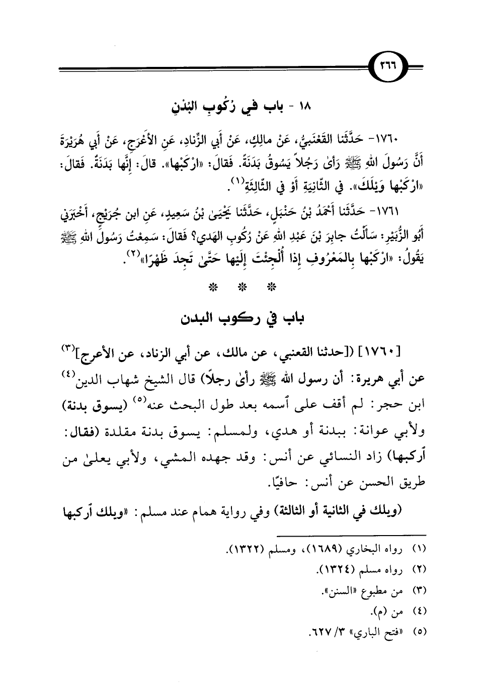 1760 - حَدَّثَنا القَعْنَبيُّ، عَنْ مالِكٍ، عَنْ أَبي الزِّنادِ، عَنِ الأَعْرَجِ، عَنْ أَبي هُرَيْرَةَ أَنَّ رَسُولَ اللهِ - صلى الله عليه وسلم - رَأى رَجُلًا يَسُوقُ بَدَنَةً. فَقَالَ: "ارْكَبْها". قَالَ: إِنَّها بَدَنَةٌ. فَقَالَ: "ارْكَبْها وَيْلَكَ". في الثَّانِيَةِ أَوْ في الثَّالِثَةِ (¬1).