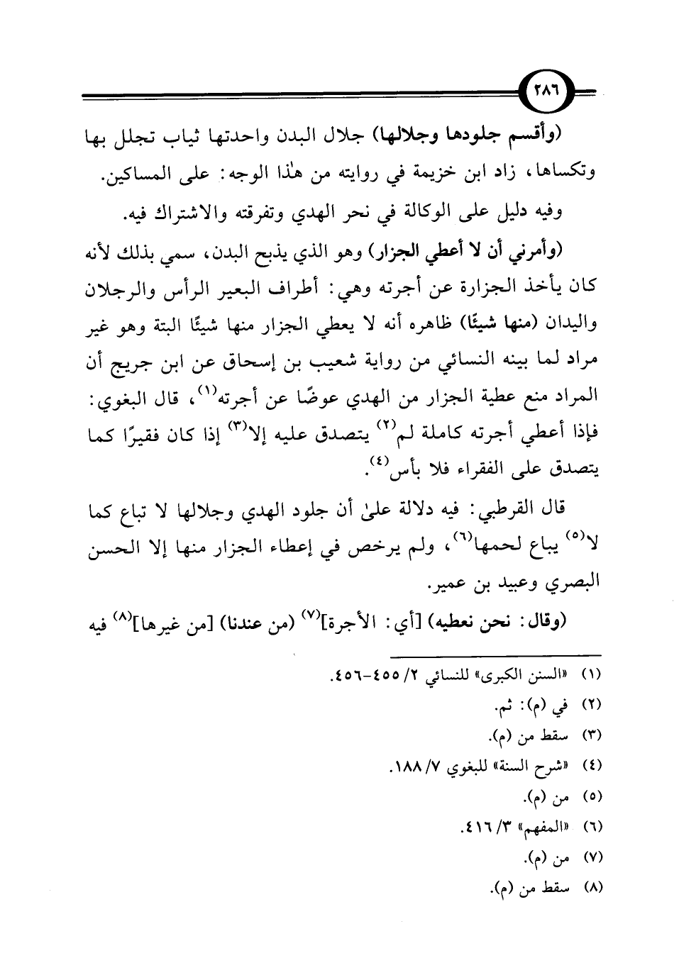 (وأقسم جلودها وجلالها) جلال البدن واحدتها ثياب تجلل بها وتكساها، زاد ابن خزيمة في روايته من هذا الوجه: على المساكين.