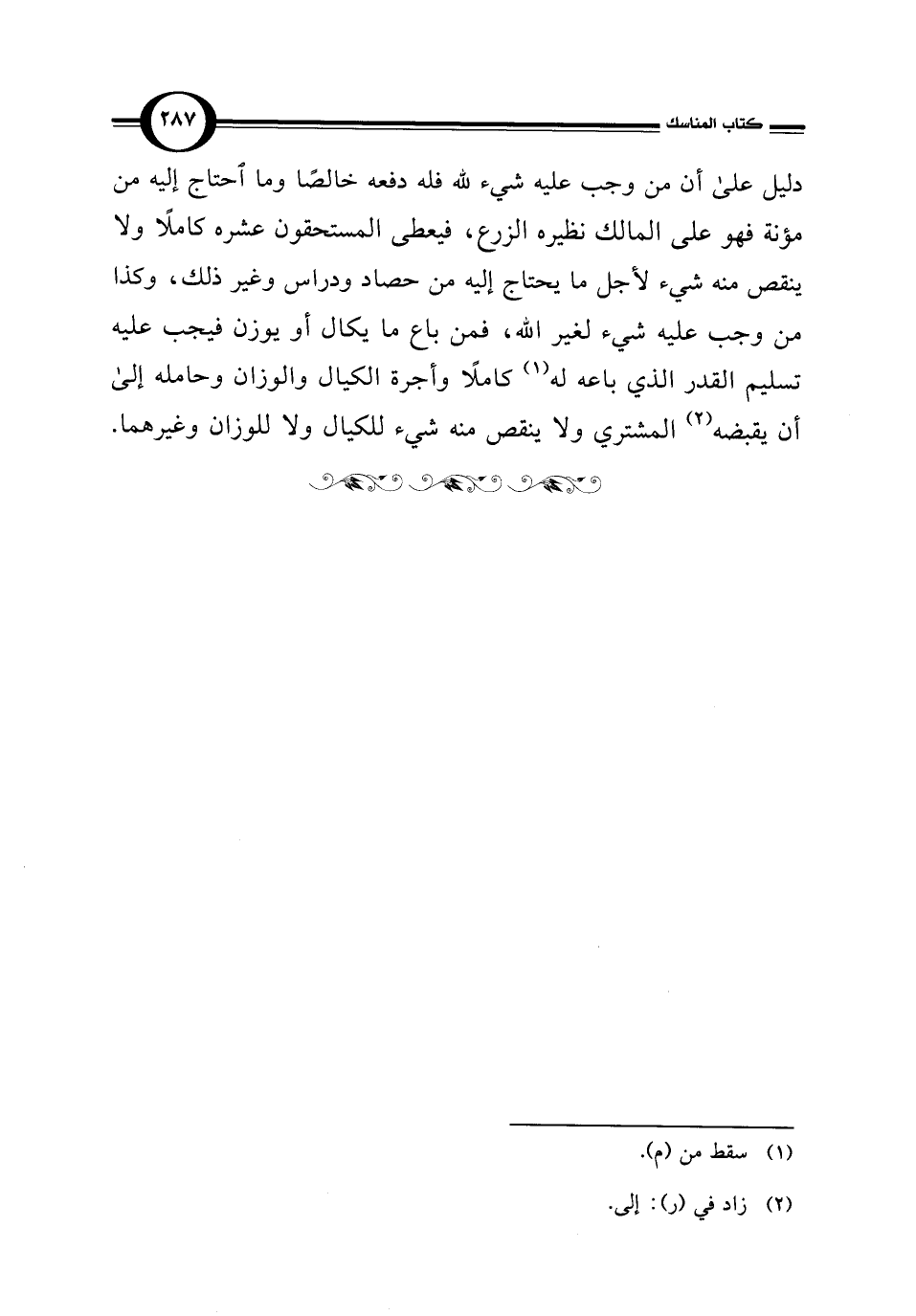 دليل على أن من وجب عليه شيء لله فله دفعه خالصًا وما احتاج إليه من مؤنة فهو على المالك نظيره الزرع، فيعطى المستحقون عشره كاملًا ولا ينقص منه شيء لأجل ما يحتاج إليه من حصاد ودراس وغير ذلك، وكذا من وجب عليه شيء لغير الله، فمن باع ما يكال أو يوزن فيجب عليه تسليم القدر الذي باعه له (¬1) كاملًا وأجرة الكيال والوزان وحامله إلى أن يقبضه (¬2) المشتري ولا ينقص منه شيء للكيال ولا للوزان وغيرهما.