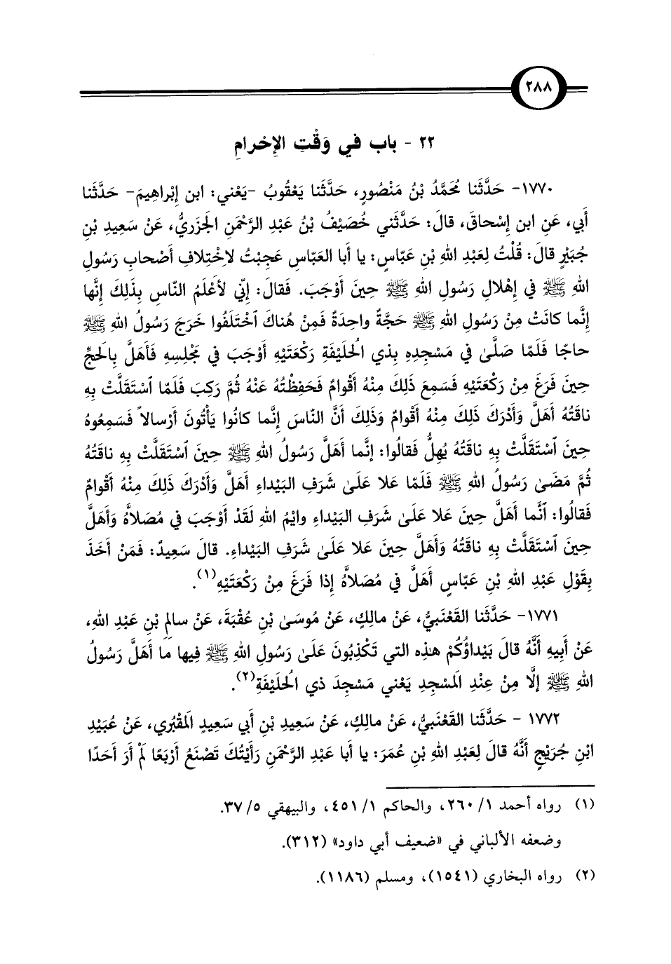 1770 - حَدَّثَنا مُحَمَّدُ بْنُ مَنْصُورٍ، حَدَّثَنا يَعْقُوبُ - يَعْني: ابن إِبْراهِيمَ - حَدَّثَنا أَبي، عَنِ ابن إِسْحاقَ، قَالَ: حَدَّثَني خُصَيْفُ بْنُ عَبْدِ الرَّحْمَنِ الجَزَريُّ، عَنْ سَعِيدِ بْنِ جُبَيْرٍ قَالَ: قُلْتُ لِعَبْدِ اللهِ بْنِ عَبَّاسٍ: يا أَبا العَبَّاسِ عَجِبْتُ لاِخْتِلافِ أَصْحابِ رَسُولِ اللهِ - صلى الله عليه وسلم - في إِهْلالِ رَسُولِ اللهِ - صلى الله عليه وسلم - حِينَ أَوْجَبَ. فَقَالَ: إِنّي لأَعْلَمُ النّاسِ بِذَلِكَ إِنَّها إِنَّما كَانَتْ مِنْ رَسُولِ اللهِ - صلى الله عليه وسلم - حَجَّةٌ واحِدَةٌ فَمِنْ هُناكَ اخْتَلَفوا خَرَجَ رَسُول اللهِ - صلى الله عليه وسلم - حاجّا فَلَمّا صَلَّى في مَسْجِدِهِ بِذي الحُلَيْفَةِ رَكْعَتَيْهِ أَوْجَبَ في مَجْلِسِهِ فَأَهَلَّ بِالحَجِّ حِينَ فَرَغَ مِنْ رَكْعَتَيْهِ فَسَمِعَ ذَلِكَ مِنْهُ أَقْوامٌ فَحَفِظْتُهُ عَنْهُ ثُمَّ رَكِبَ فَلَمَّا اسْتَقَلَّتْ بِهِ ناقَتُهُ أَهَلَّ وَأَدْرَكَ ذَلِكَ مِنْهُ أَقْوامٌ وَذَلِكَ أَنَّ النَّاسَ إِنَّما كَانُوا يَأْتُونَ أَرْسالًا فَسَمِعُوهُ حِينَ اسْتَقَلَّتْ بِهِ ناقَتُهُ يُهِلُّ فَقَالُوا: إنَّما أَهَلَّ رَسُولُ اللهِ - صلى الله عليه وسلم - حِينَ اسْتَقَلَّتْ بِهِ ناقَتُهُ ثُمَّ مَضَى رَسُولُ اللهِ - صلى الله عليه وسلم - فَلَمّا عَلا عَلَى شَرَفِ البَيْداءِ أَهَلَّ وَأَدْرَكَ ذَلِكَ مِنْهُ أَقْوامٌ فَقَالُوا: انَّما أَهَلَّ حِينَ عَلا عَلَى شَرَفِ البَيْداءِ وايْمُ اللهِ لَقَدْ أَوْجَبَ في مُصَلَّاهُ وَأَهَلَّ حِينَ اسْتَقَلَّتْ بِهِ ناقَتُهُ وَأَهَلَّ حِينَ عَلا عَلَى شَرَفِ البَيْداءِ. قَالَ سَعِيدٌ: فَمَنْ أَخَذَ بِقَوْلِ عَبْدِ اللهِ بْنِ عَبَّاسٍ أَهَلَّ في مُصَلَّاهُ إِذَا فَرَغَ مِنْ رَكْعَتَيْهِ (¬1).