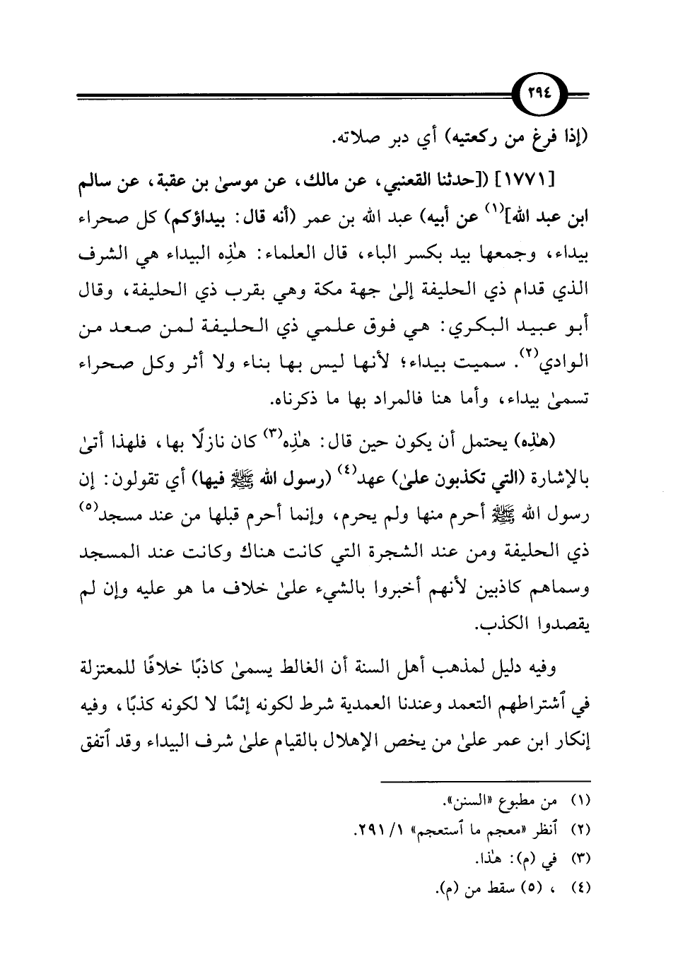 [1771] ([حدثنا القعنبي، عن مالك، عن موسى بن عقبة، عن سالم بن عبد الله] (¬1) عن أبيه) عبد الله بن عمر (أنه قال: بيداؤكم) كل صحراء بيداء، وجمعها بيد بكسر الباء، قال العلماء: هذِه البيداء هي الشرف الذي قدام ذي الحليفة إلى جهة مكة وهي بقرب ذي الحليفة، وقال أبو عبيد البكري: هي فوق علمي ذي الحليفة لمن صعد من الوادي (¬2). سميت بيداء؛ لأنها ليس بها بناء ولا أثر وكل صحراء تسمى بيداء، وأما هنا فالمراد بها ما ذكرناه.