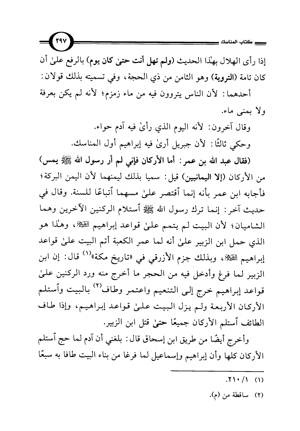 (فقال عبد الله بن عمر: أما الأركان فإني لم أر رسول الله - صلى الله عليه وسلم - يمس) من الأركان (إلا اليمانيين) قيل: سميا بذلك ليمنهما لأن اليمن البركة؛ فأجابه ابن عمر بأنه إنما اقتصر على مسهما اتباعًا للسنة. وقال في حديث آخر: إنما ترك رسول الله - صلى الله عليه وسلم - استلام الركنين الآخرين وهما الشاميان؛ لأن البيت لم يتمم على قواعد إبراهيم - عليه السلام -، وهذا هو الذي حمل ابن الزبير على أنه لما عمر الكعبة أتم البيت على قواعد إبراهيم - عليه السلام -، وبذلك جزم الأزرقي في "تاريخ مكة" (¬1) قال: إن ابن الزبير لما فرغ وأدخل فيه من الحجر ما أخرج منه ورد الركنين على قواعد إبراهيم خرج إلى التنعيم واعتمر وطاف (¬2) بالبيت واستلم الأركان الأربعة ولم يزل البيت على قواعد إبراهيم، وإذا طاف الطائف استلم الأركان جميعًا حتى قتل ابن الزبير.