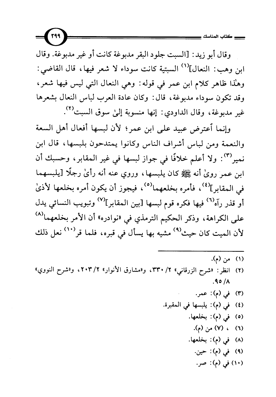 وإنما اعترض عبيد على ابن عمر؛ لأن لبسها أفعال أهل السعة والنعمة ومن لباس أشراف الناس وكانوا يمتدحون بلبسها، قال ابن نمير (¬3): ولا أعلم خلافًا في جواز لبسها في غير المقابر، وحسبك أن ابن عمر روى أنه - صلى الله عليه وسلم - كان يلبسها، وروي عنه أنه رأى رجلًا [يلبسهما في المقابر] (¬4)، فأمره بخلعهما (¬5)، فيجوز أن يكون أمره بخلعها لأذى أو قذر رآه (¬6) فيها فكره قوم لبسها [بين المقابر] (¬7) وتبويب النسائي يدل على الكراهة، وذكر الحكيم الترمذي في "نوادره" أن الأمر بخلعهما (¬8) لأن الميت كان حيث (¬9) مشيه بها يسأل في قبره، فلما قر (¬10) نعل ذلك