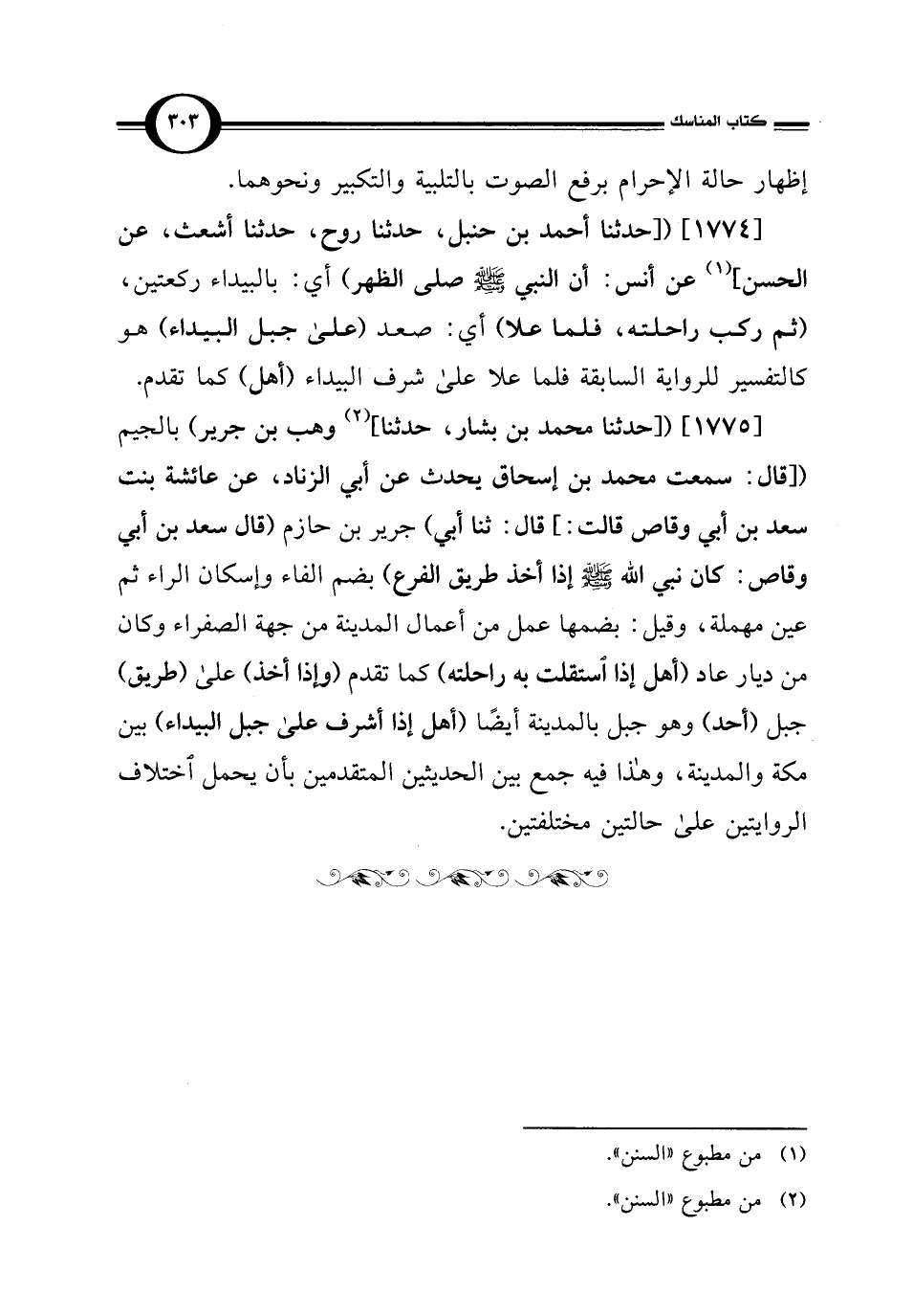 [1774] ([حدثنا أحمد بن حنبل، حدثنا روح، حدثنا أشعث، عن الحسن] (¬1) عن أنس: أن النبي - صلى الله عليه وسلم - صلى الظهر) أي: بالبيداء ركعتين، (ثم ركب راحلته، فلما علا) أي: صعد (على جبل البيداء) هو كالتفسير للرواية السابقة فلما علا على شرف البيداء (أهل) كما تقدم.